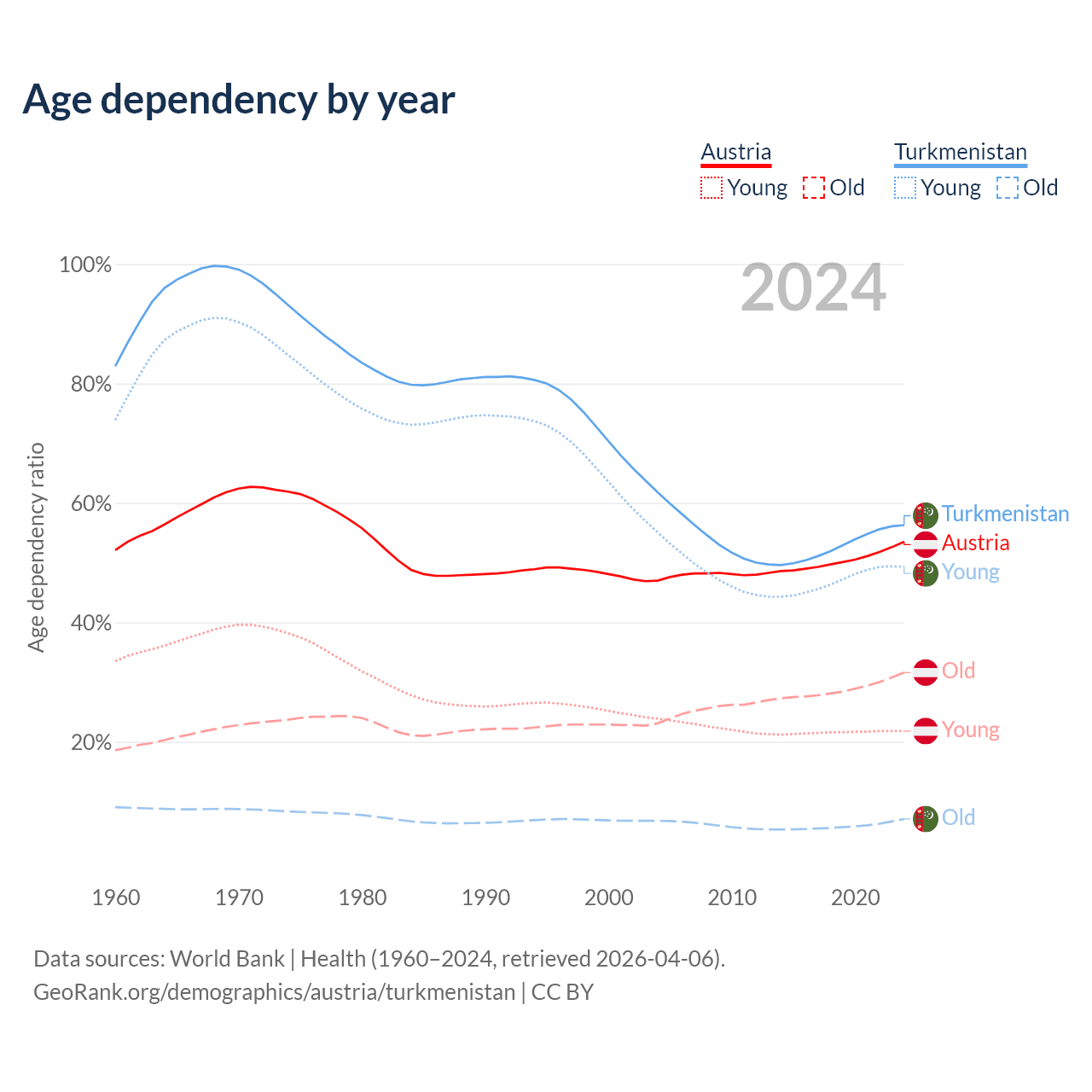 Data sources: World Bank | Health (1960–2024, retrieved 2026-04-06); U.S. Census Bureau (1960–2024, retrieved 2026-02-08).