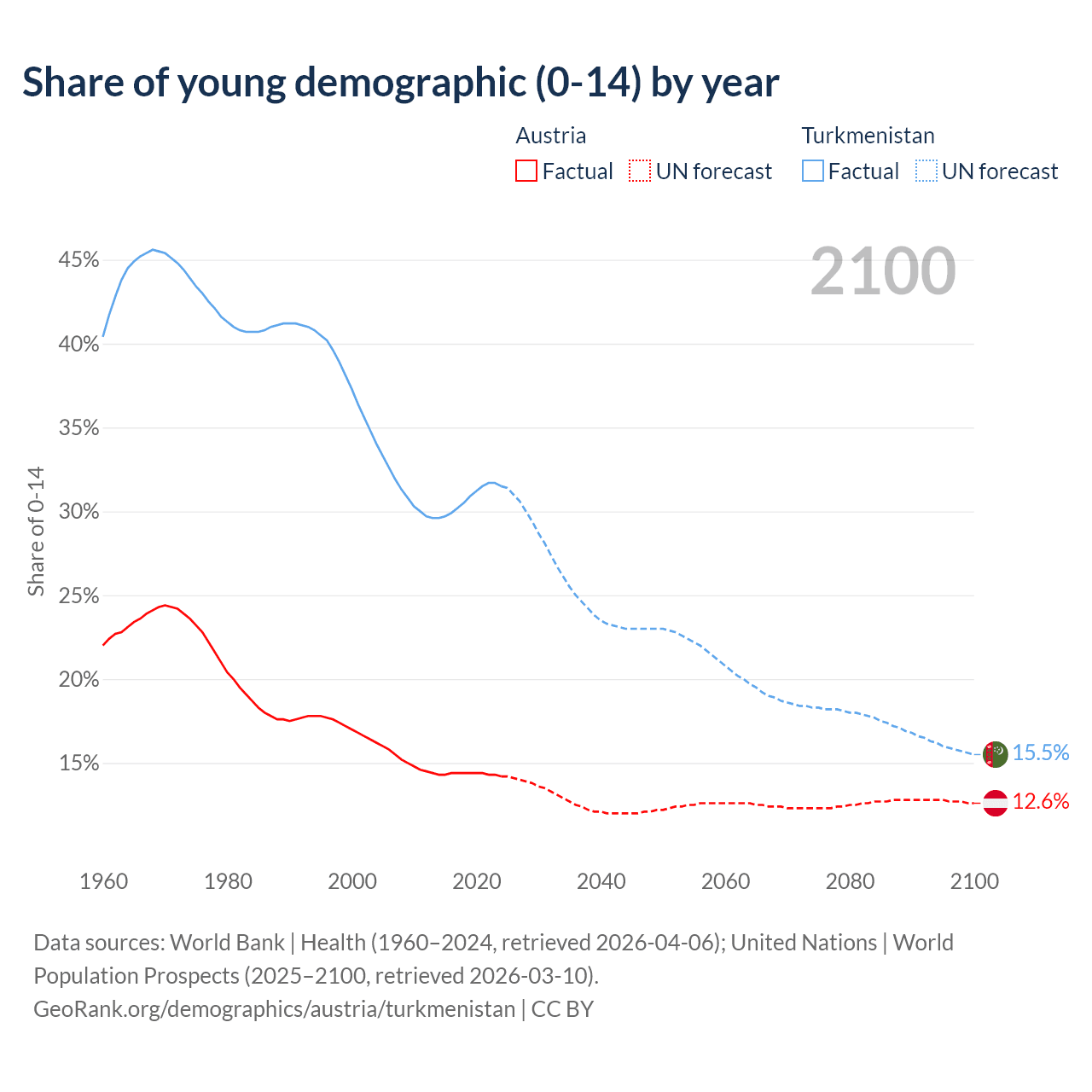 - The share of young demographic (0-15 years old) in Austria is 14.2% vs 31.5% in Turkmenistan.