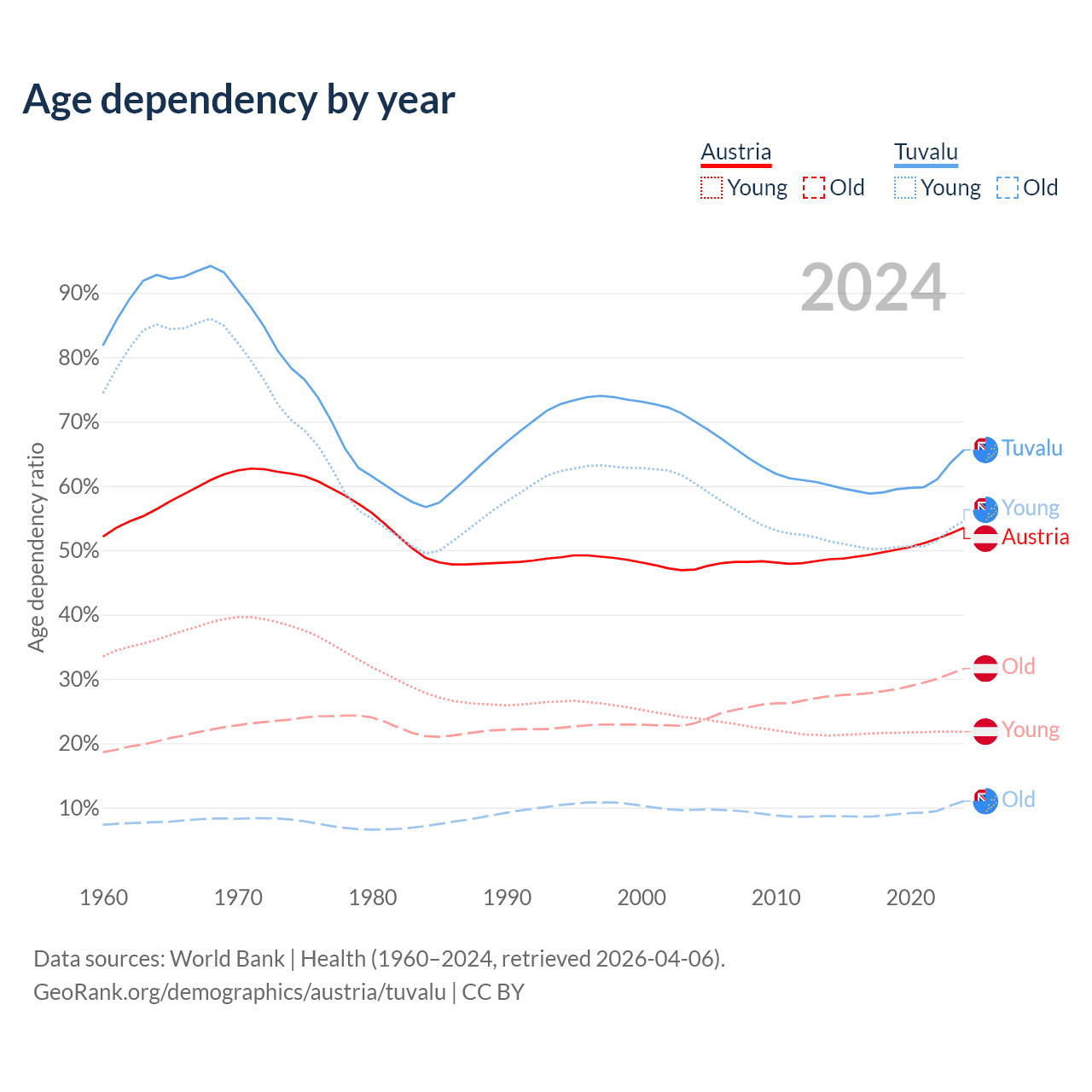 - The share of old-age demographic (65+) in Austria is 20.6% vs 6.67% in Tuvalu.