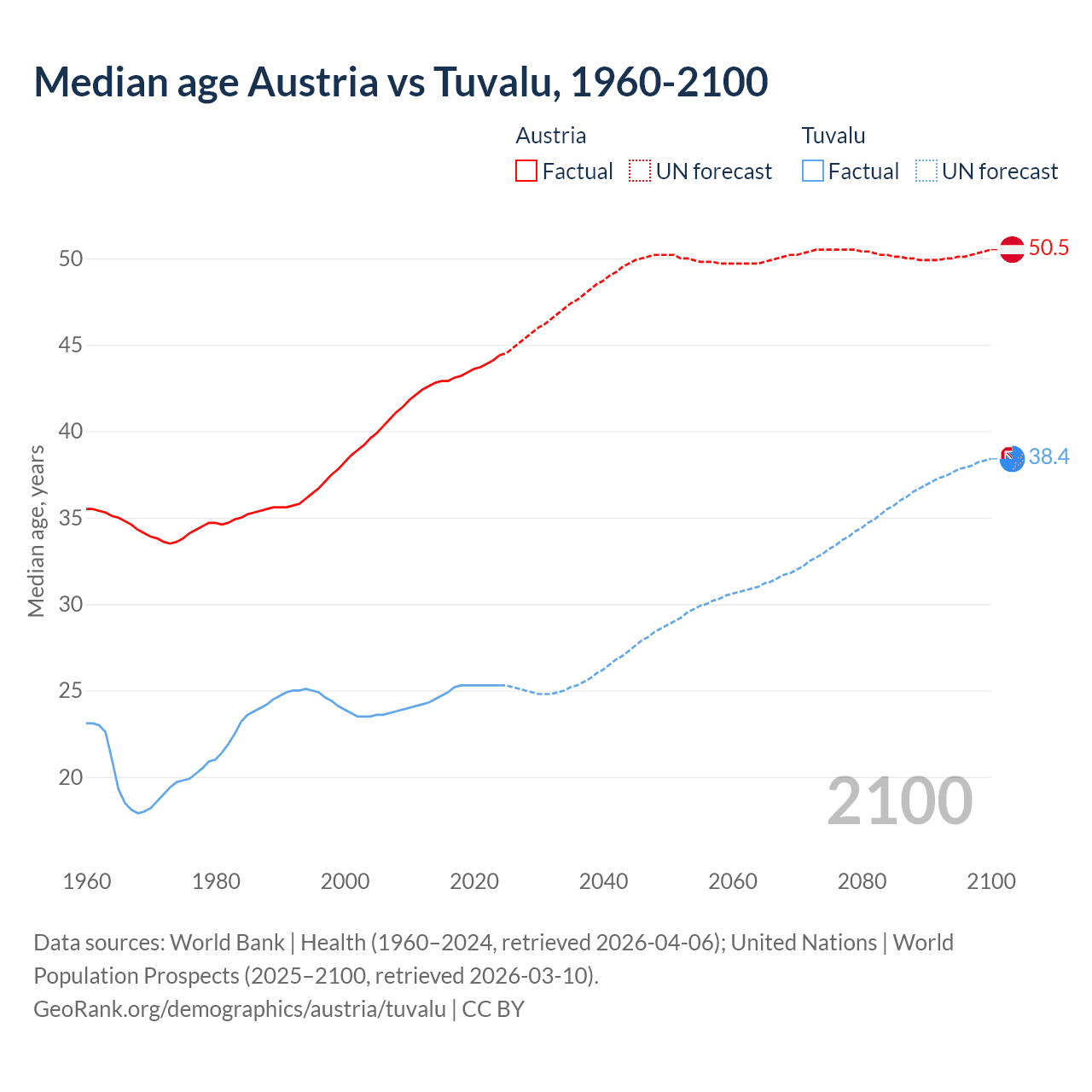 - The median age in Austria is 44.4 years compared to 25.3 years in Tuvalu.