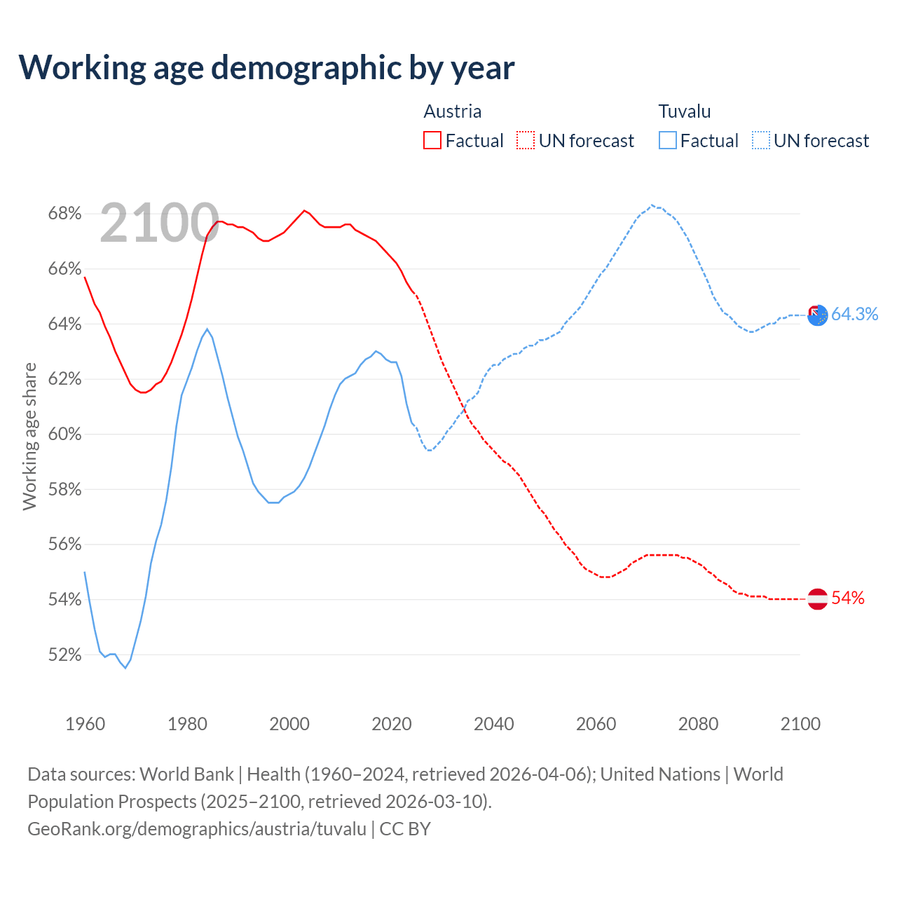 - Austria has 5.97M working age adults (aged 15-64) vs 5.64K in Tuvalu.
