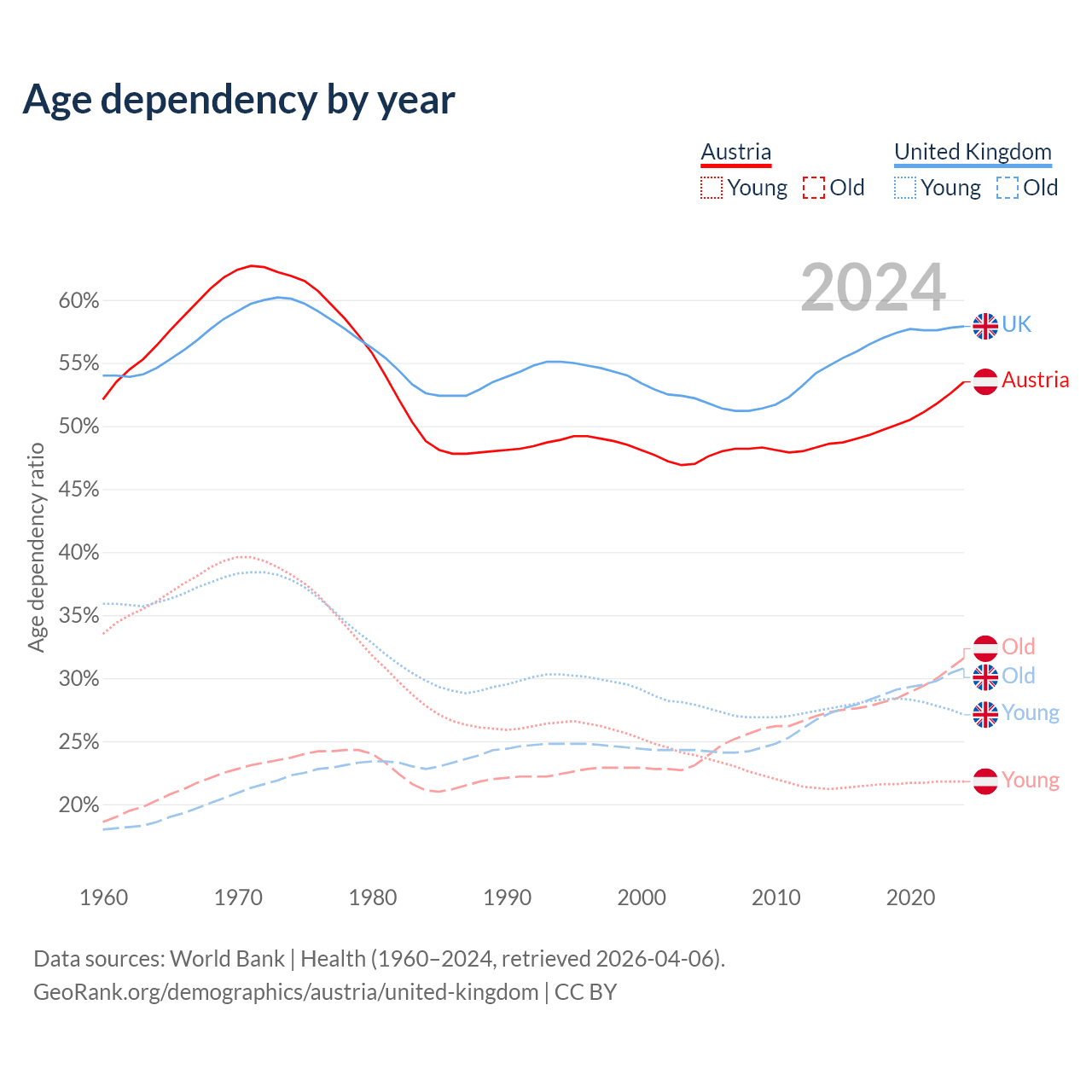 Data sources: World Bank | Health (1960–2024, retrieved 2026-04-06); U.S. Census Bureau (1960–2024, retrieved 2026-02-08).