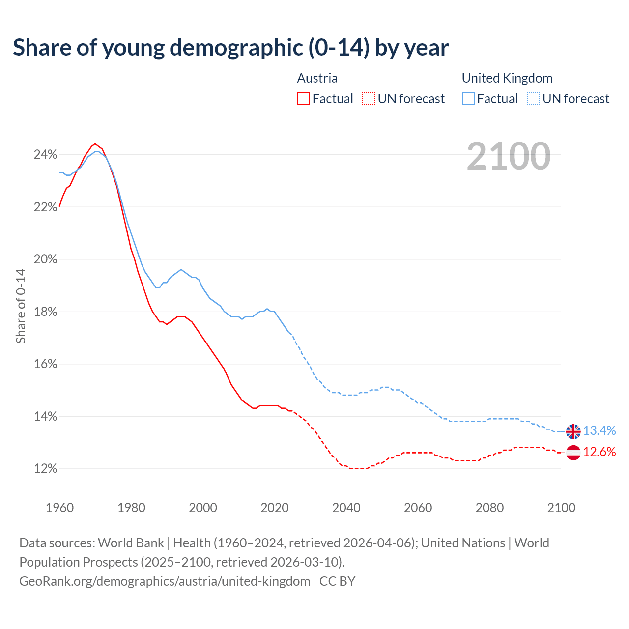 - The share of young demographic (0-15 years old) in Austria is 14.2% vs 17.2% in the United Kingdom.