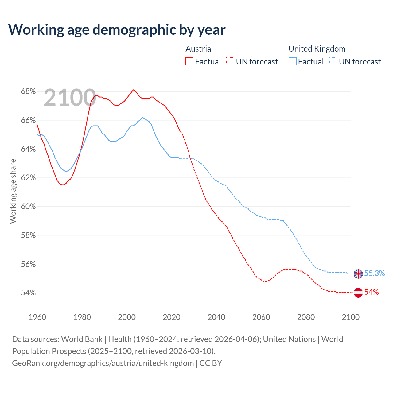 Median age Austria vs United Kingdom, 1960-2100