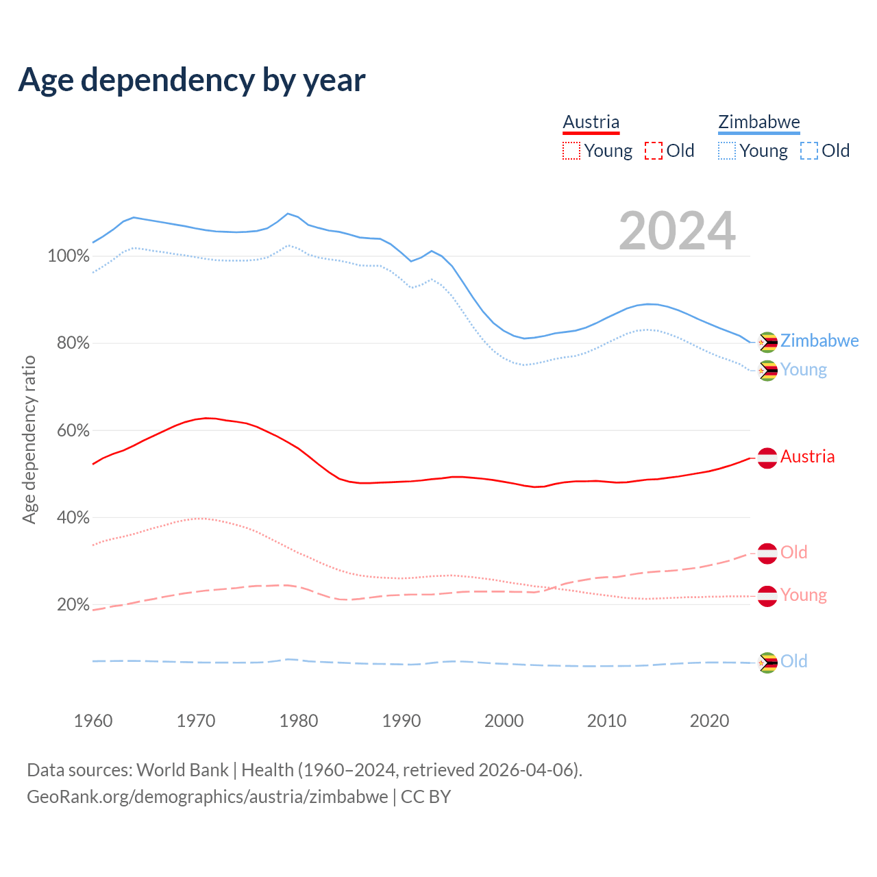 - The share of old-age demographic (65+) in Austria is 20.6% vs 3.6% in Zimbabwe.