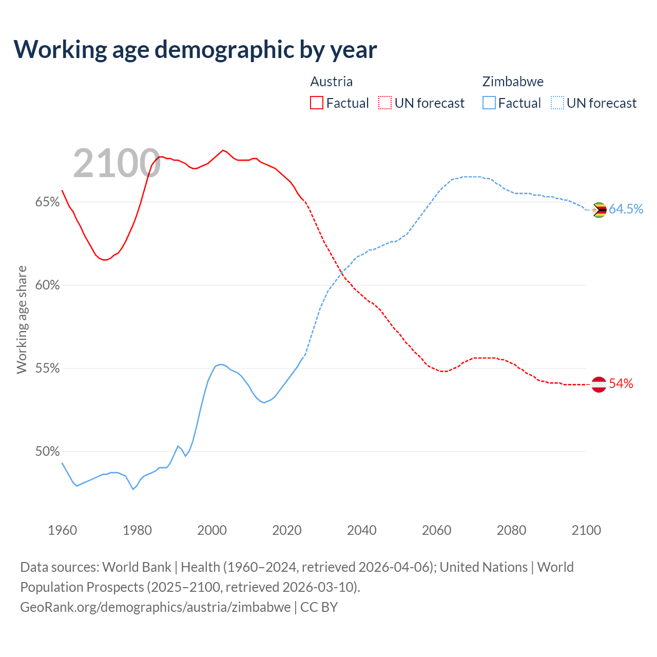 Median age Austria vs Zimbabwe, 1960-2100