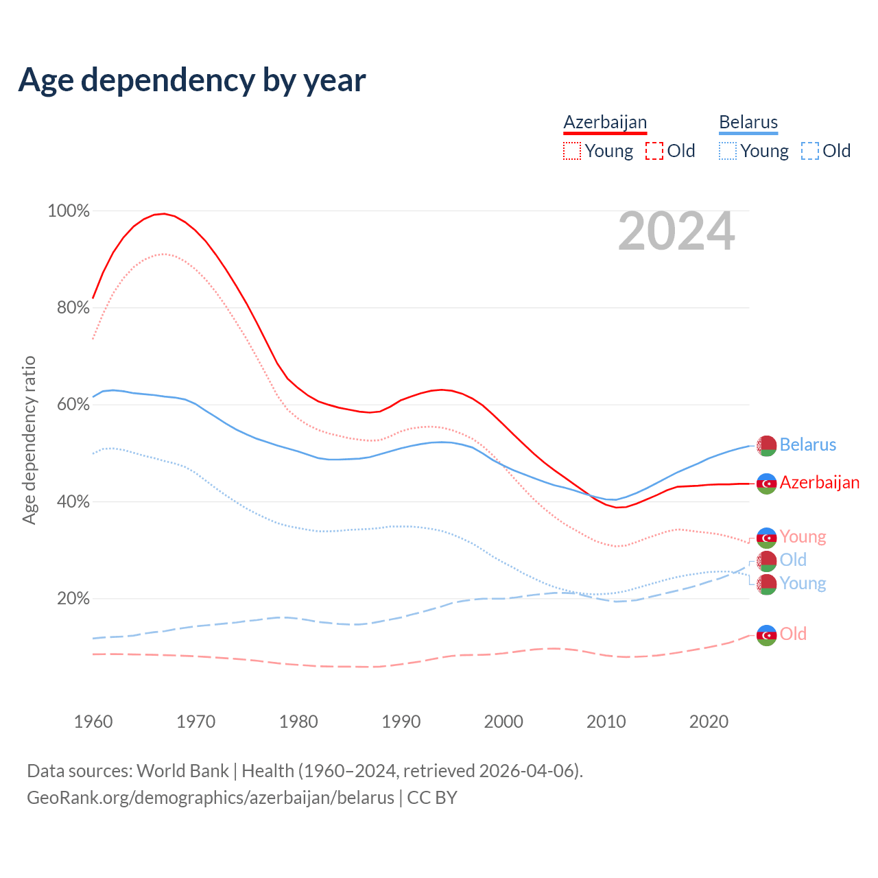 - Azerbaijan is ranked 82/196 by median age (oldest to youngest) vs 35/196 for Belarus.