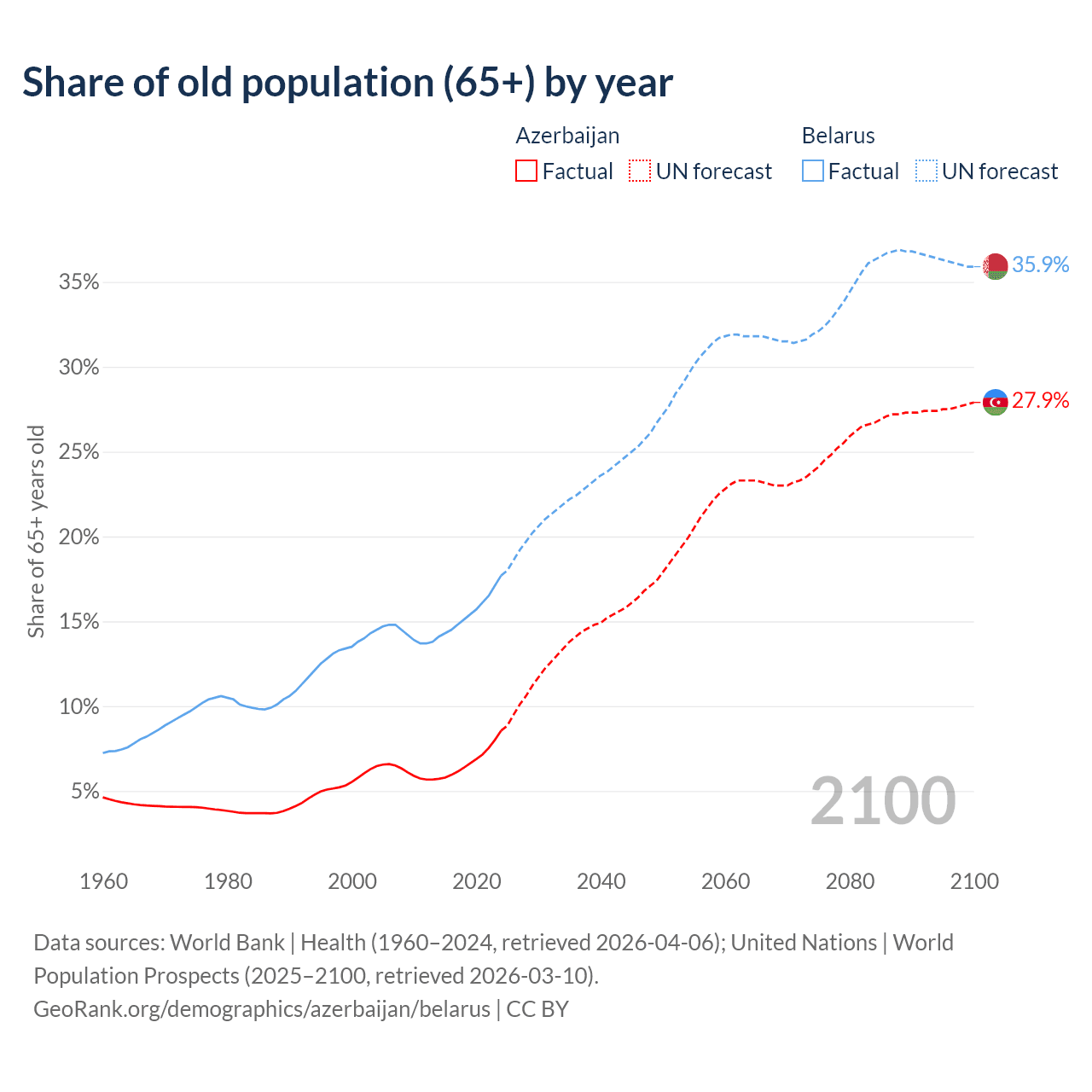 The share of older people aged 65 and over is 8.56% in Azerbaijan and 17.7% in Belarus. Life expectancy in Azerbaijan compared to Belarus .