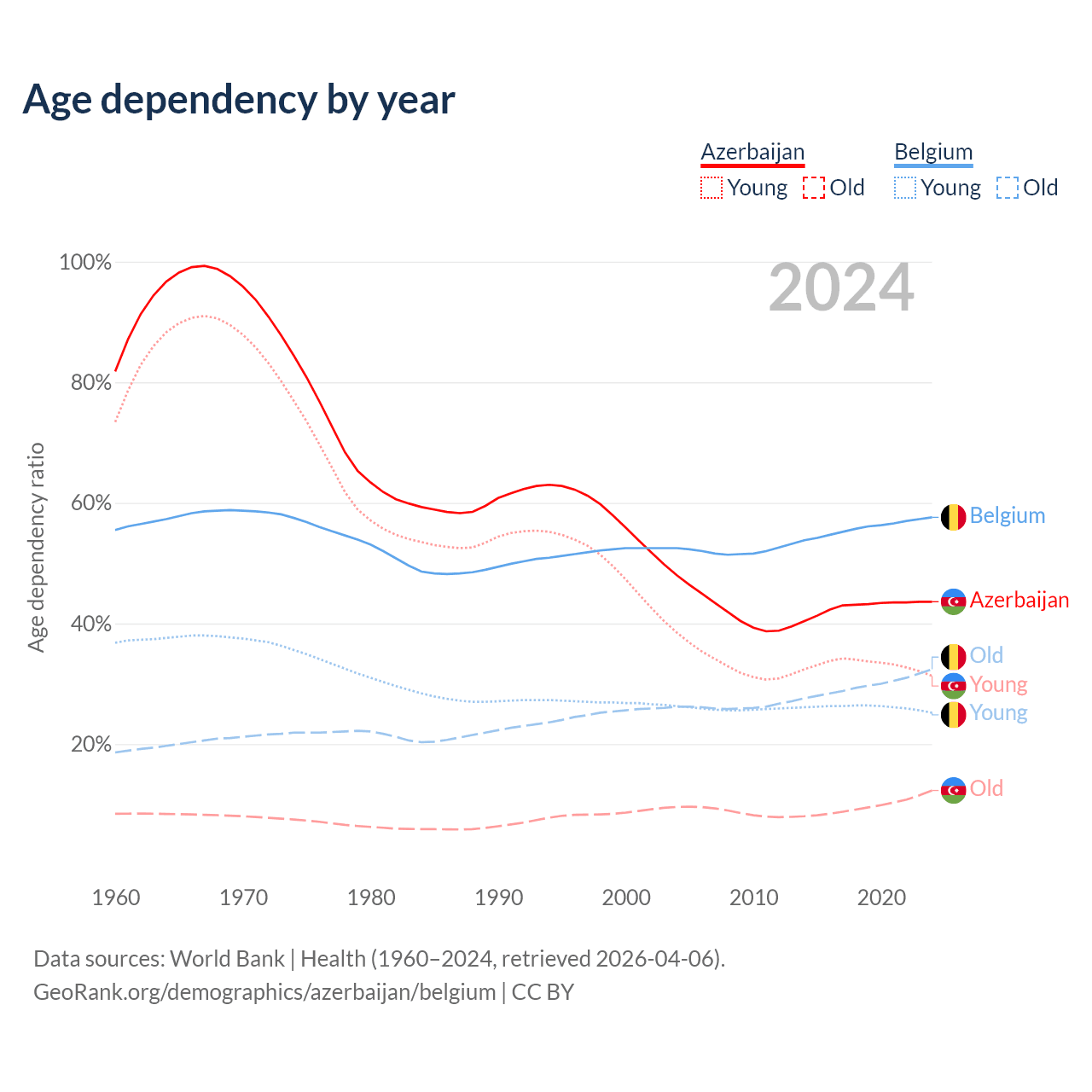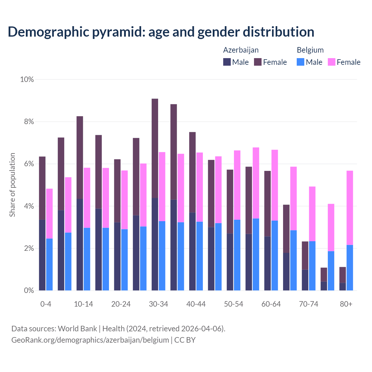 - Azerbaijan is ranked 82/196 by median age (oldest to youngest) vs 32/196 for Belgium.