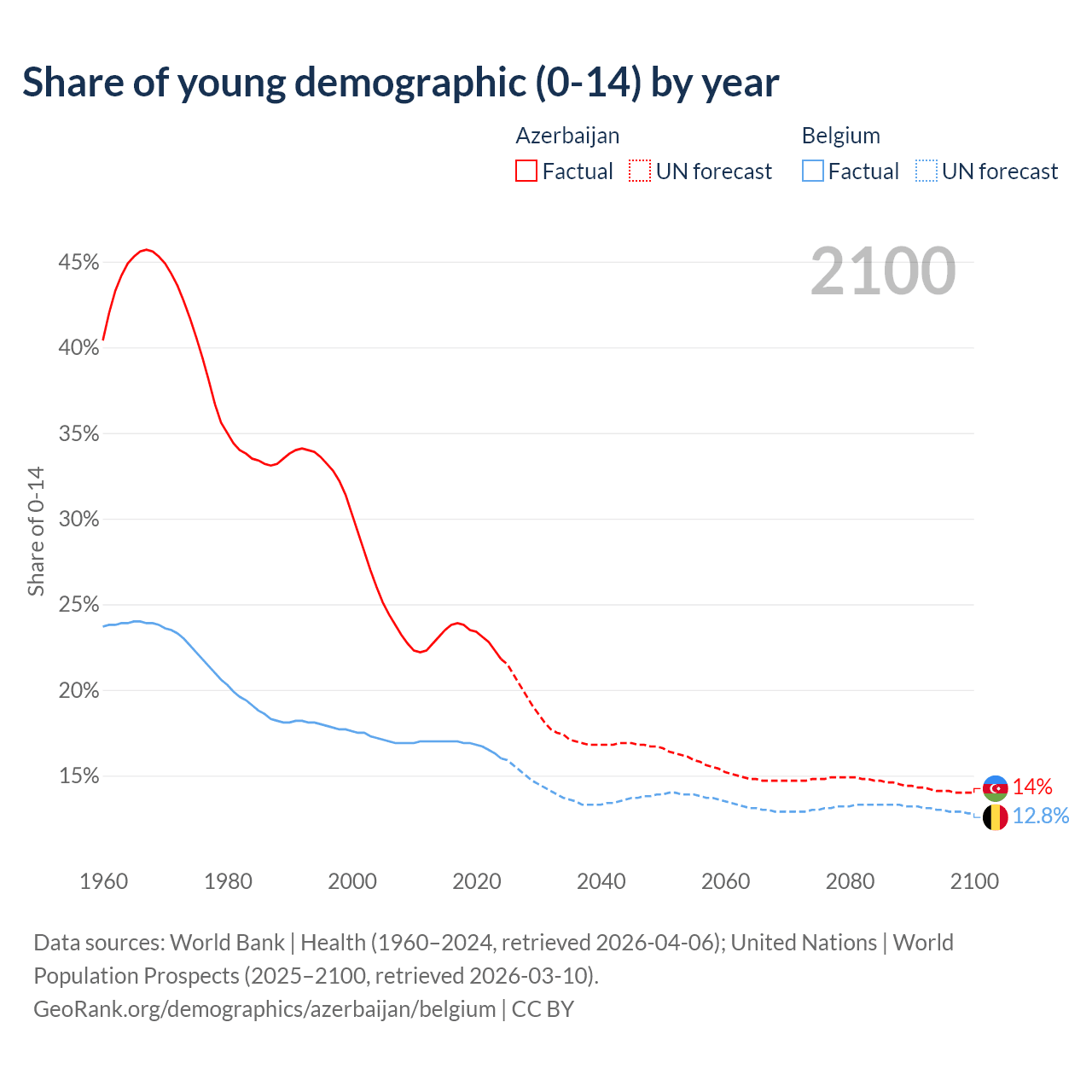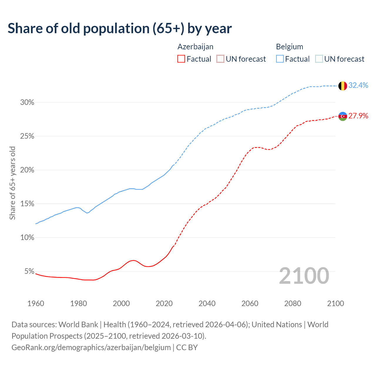 Median age Azerbaijan vs Belgium, 1960-2100