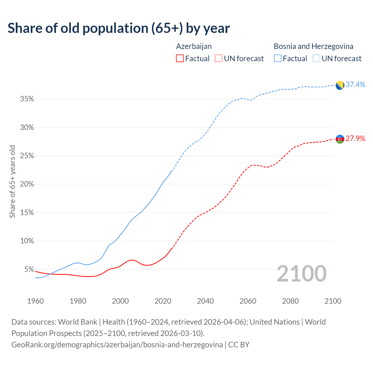 The share of older people aged 65 and over is 8.56% in Azerbaijan and 22.2% in Bosnia and Herzegovina. Life expectancy in Azerbaijan compared to Bosnia and Herzegovina .