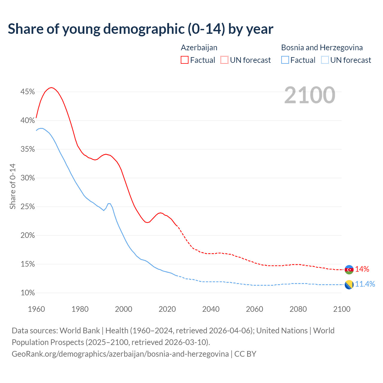 - The share of young demographic (0-15 years old) in Azerbaijan is 21.8% vs 13% in Bosnia and Herzegovina.