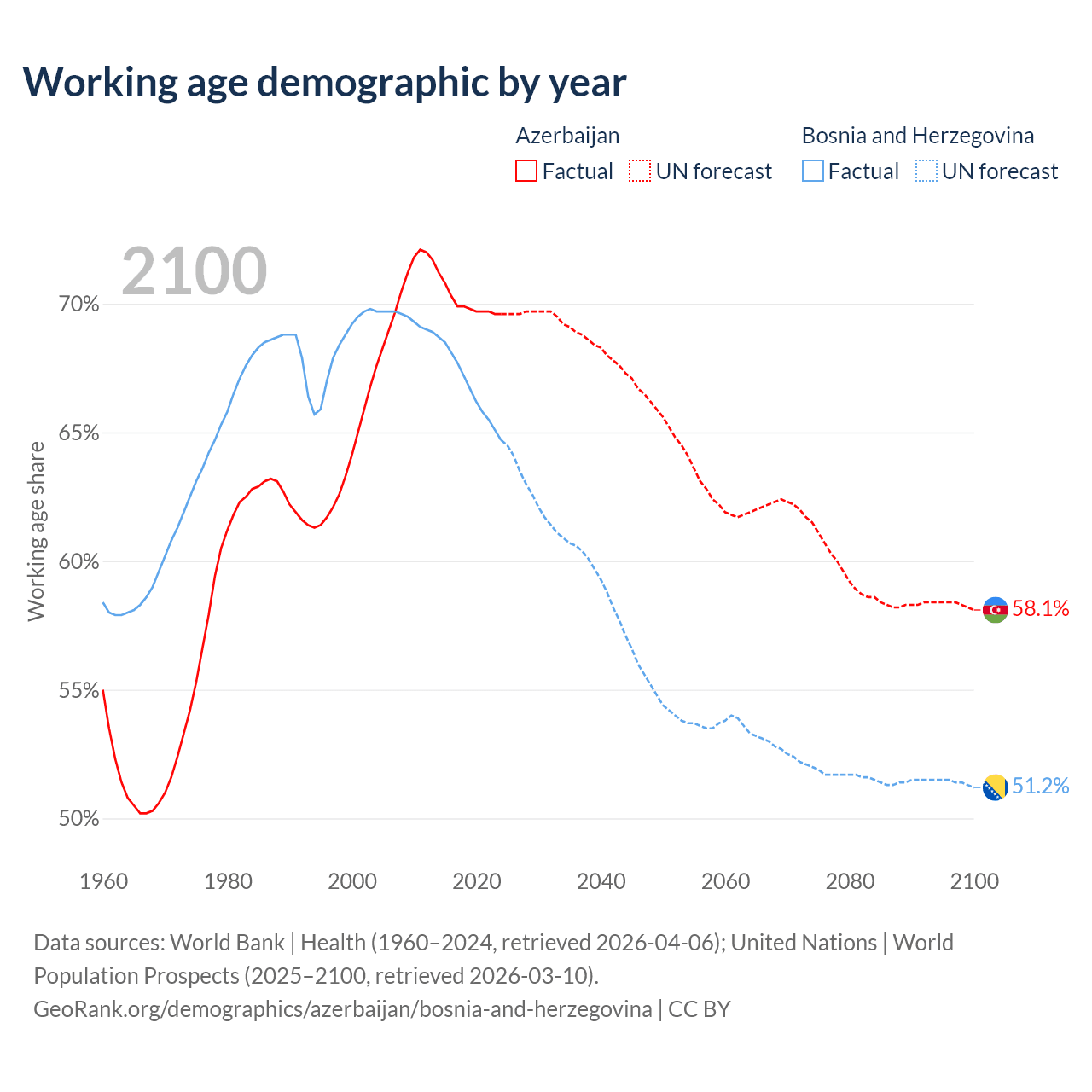 - The share of old-age demographic (65+) in Azerbaijan is 8.56% vs 22.2% in Bosnia and Herzegovina.