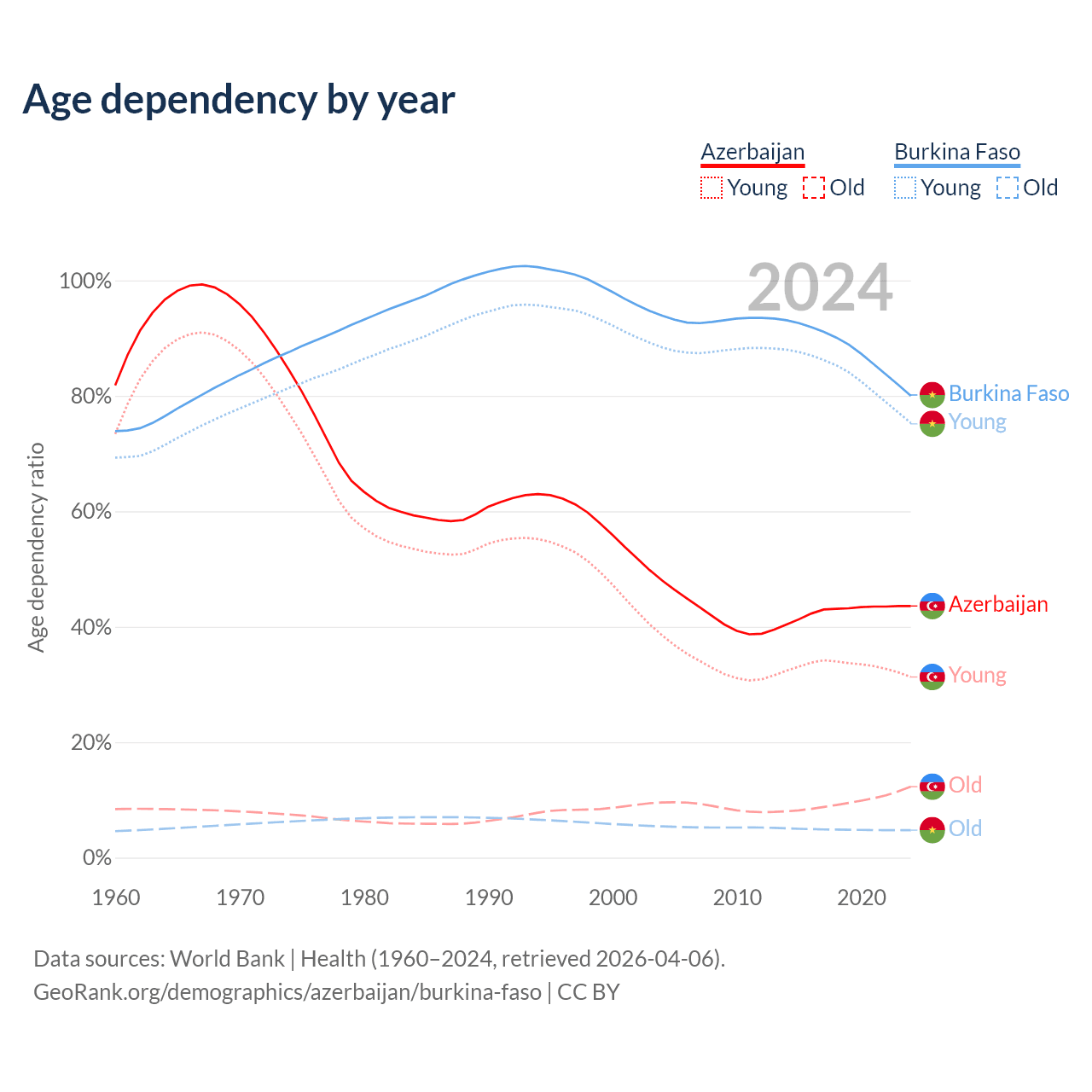 - The share of old-age demographic (65+) in Azerbaijan is 8.56% vs 2.65% in Burkina Faso.