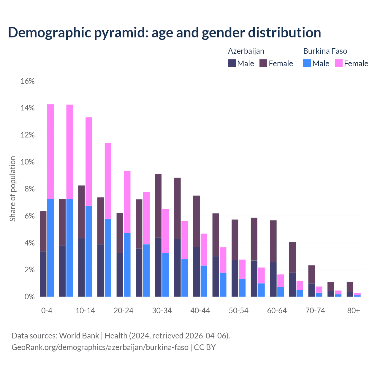 The share of older people aged 65 and over is 8.56% in Azerbaijan and 2.65% in Burkina Faso. Life expectancy in Azerbaijan compared to Burkina Faso .