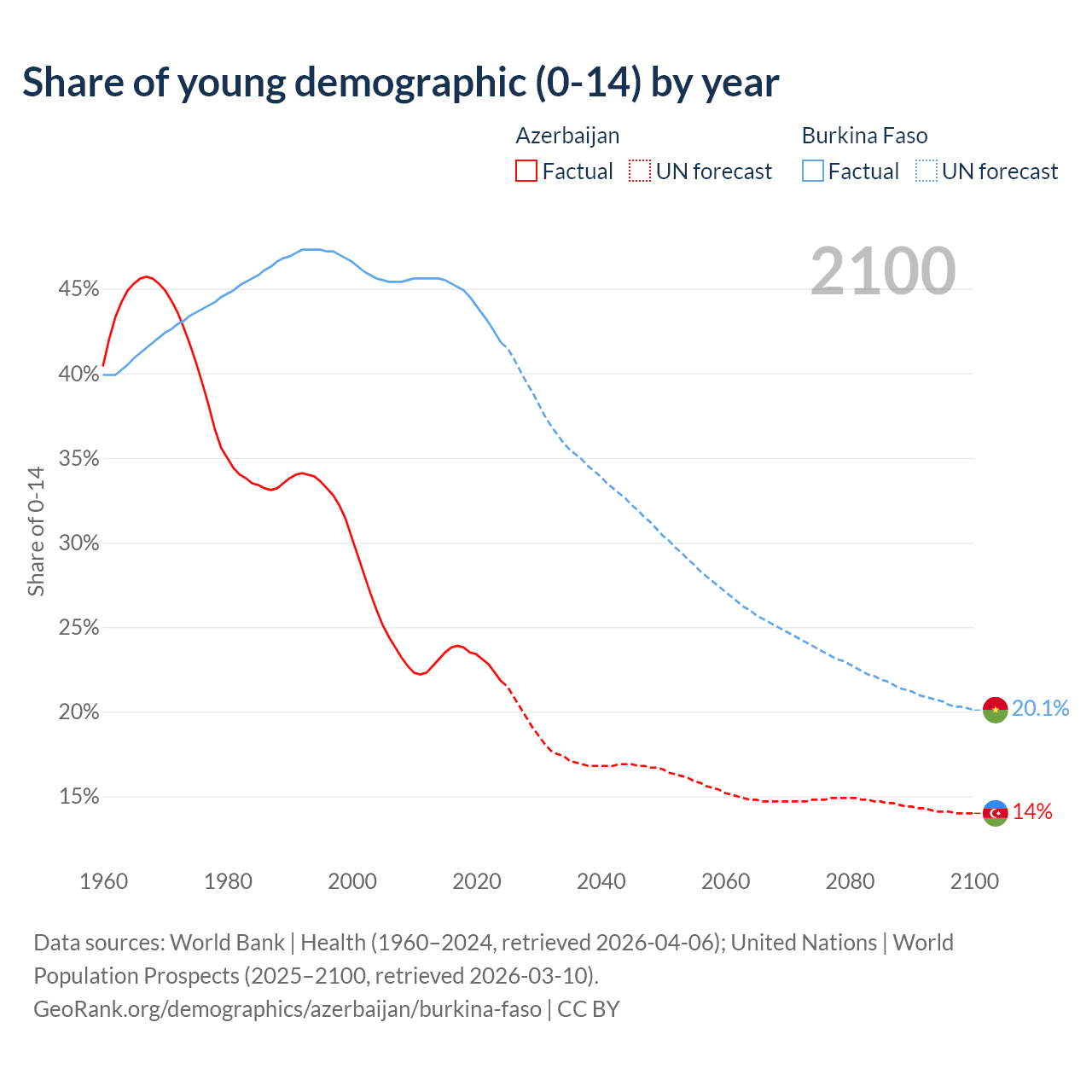 - The share of young demographic (0-15 years old) in Azerbaijan is 21.8% vs 41.8% in Burkina Faso.