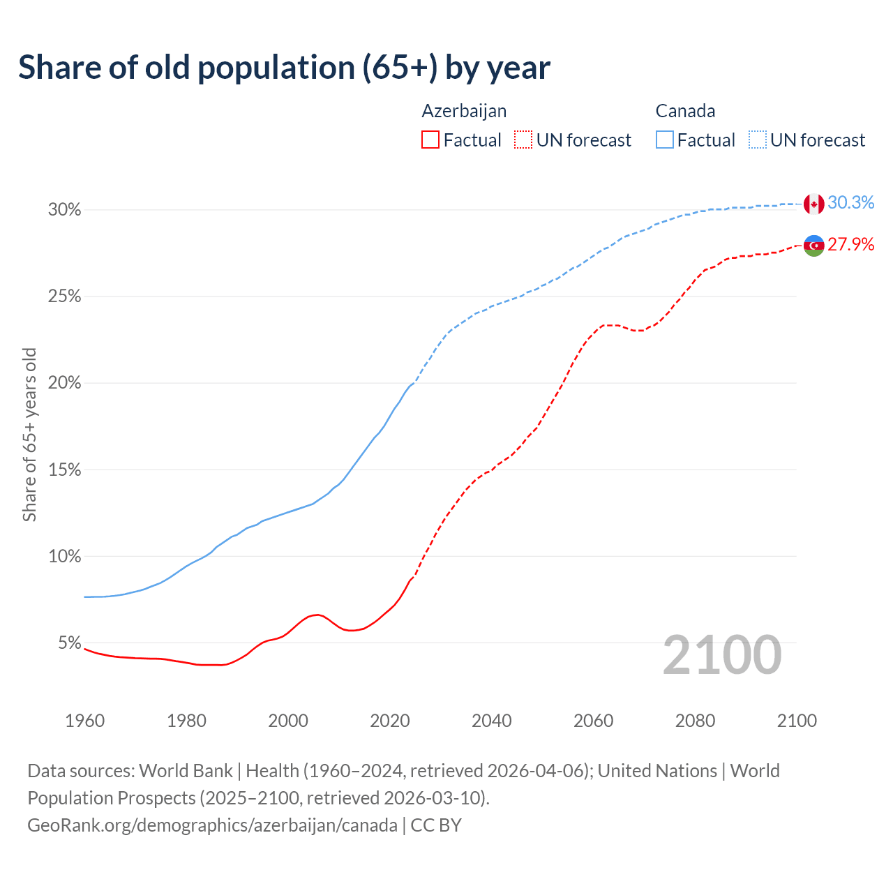 The share of older people aged 65 and over is 8.56% in Azerbaijan and 19.8% in Canada. Life expectancy in Azerbaijan compared to Canada .