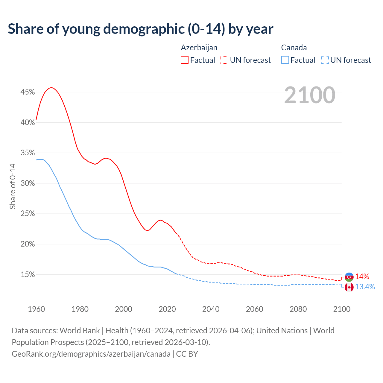 - The share of young demographic (0-15 years old) in Azerbaijan is 21.8% vs 15.1% in Canada.