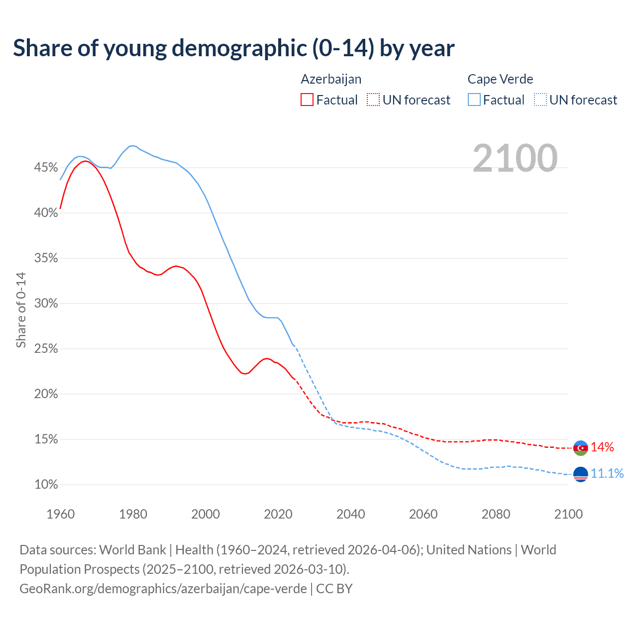 - The share of young demographic (0-15 years old) in Azerbaijan is 21.8% vs 25.5% in Cape Verde.