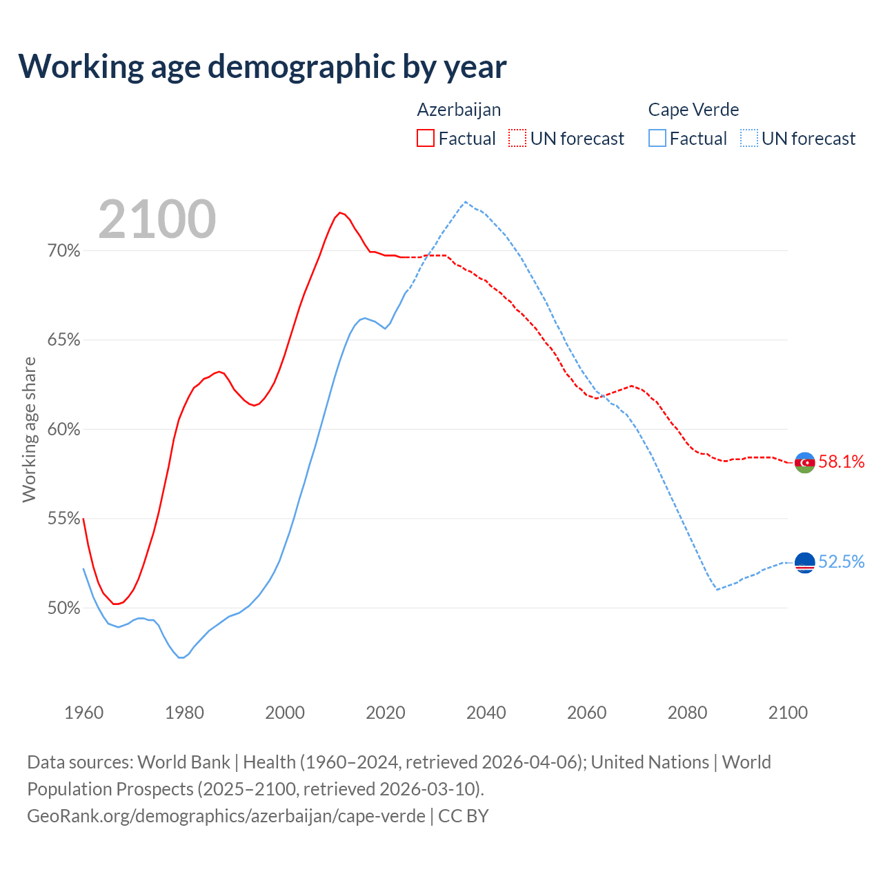 Median age Azerbaijan vs Cape Verde, 1960-2100