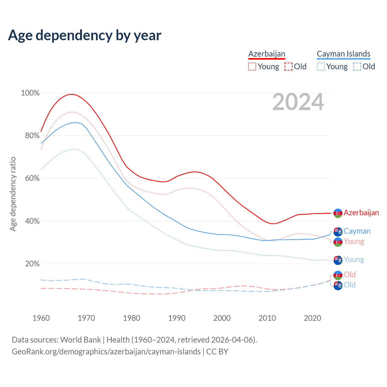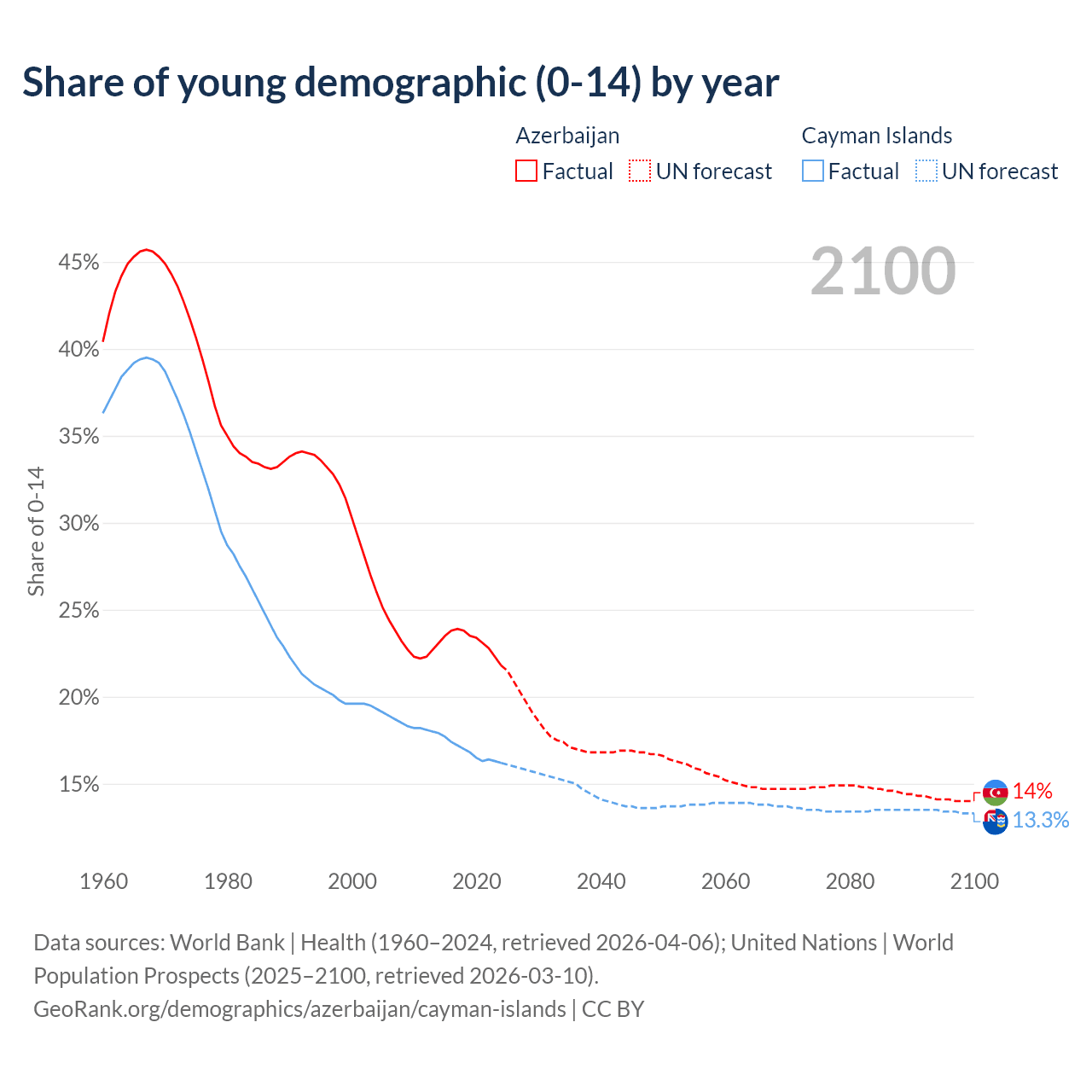 - The share of young demographic (0-15 years old) in Azerbaijan is 21.8% vs 16.2% in the Cayman Islands.