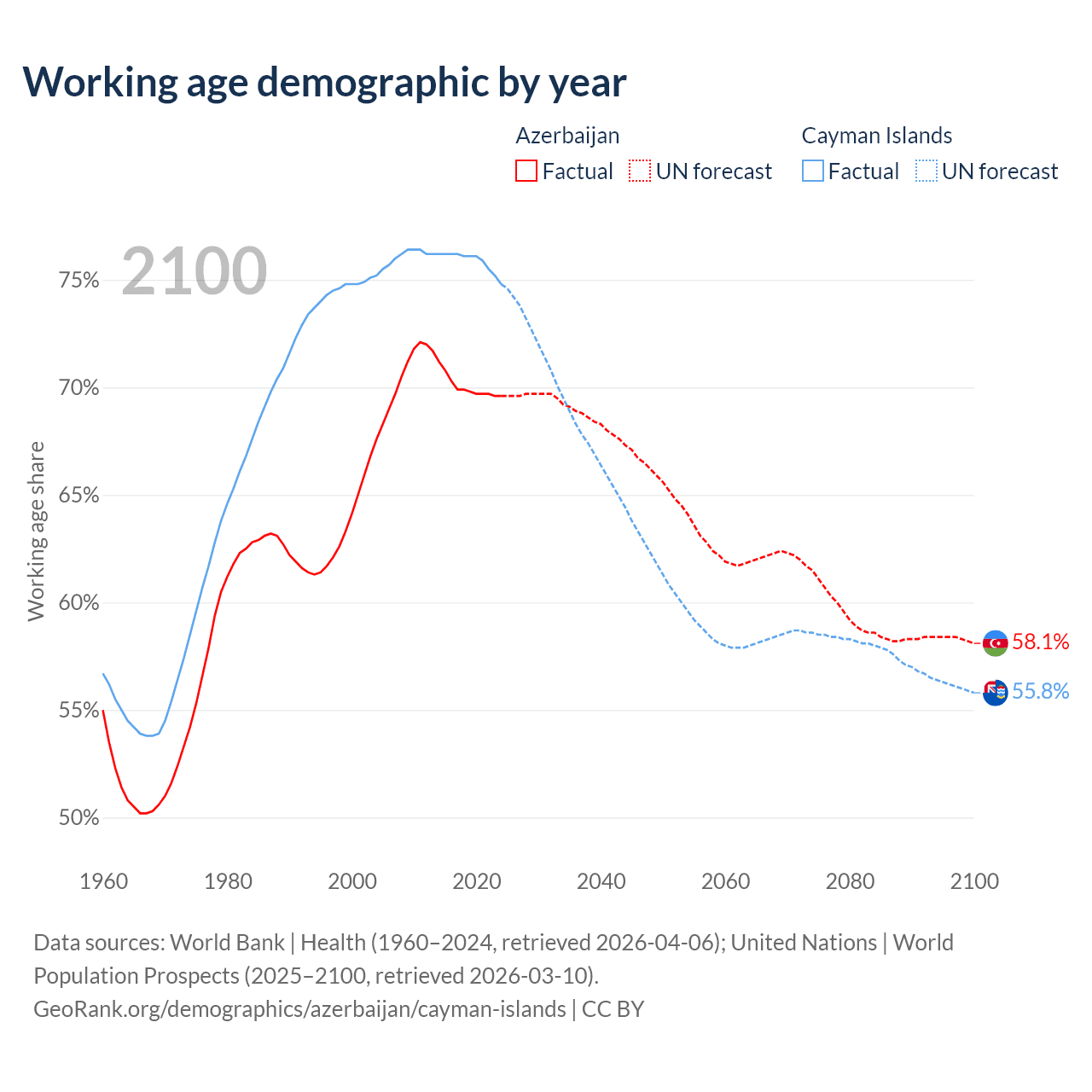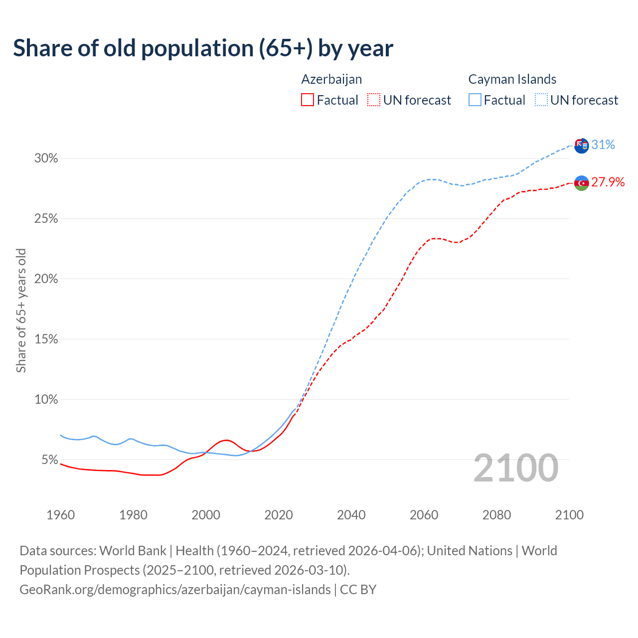 Median age Azerbaijan vs Cayman Islands, 1960-2100