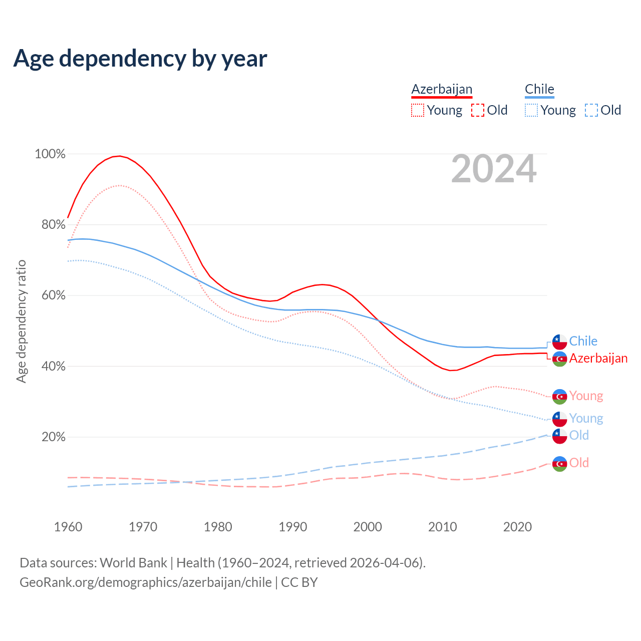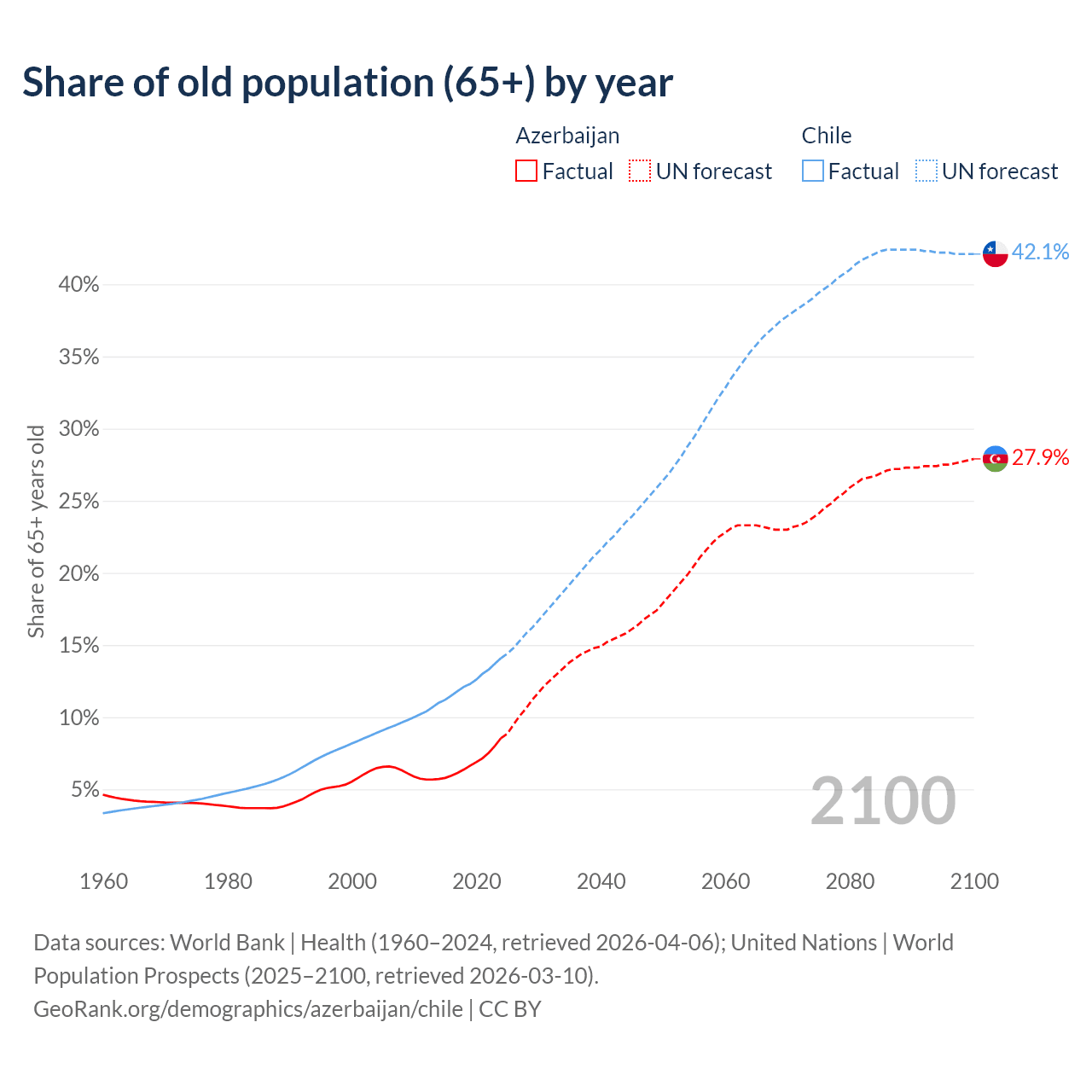 - The share of old-age demographic (65+) in Azerbaijan is 8.56% vs 14.1% in Chile.