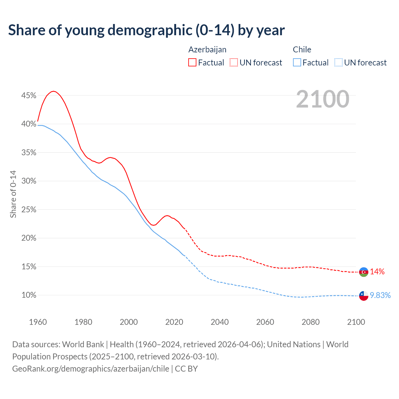 - The share of young demographic (0-15 years old) in Azerbaijan is 21.8% vs 17% in Chile.