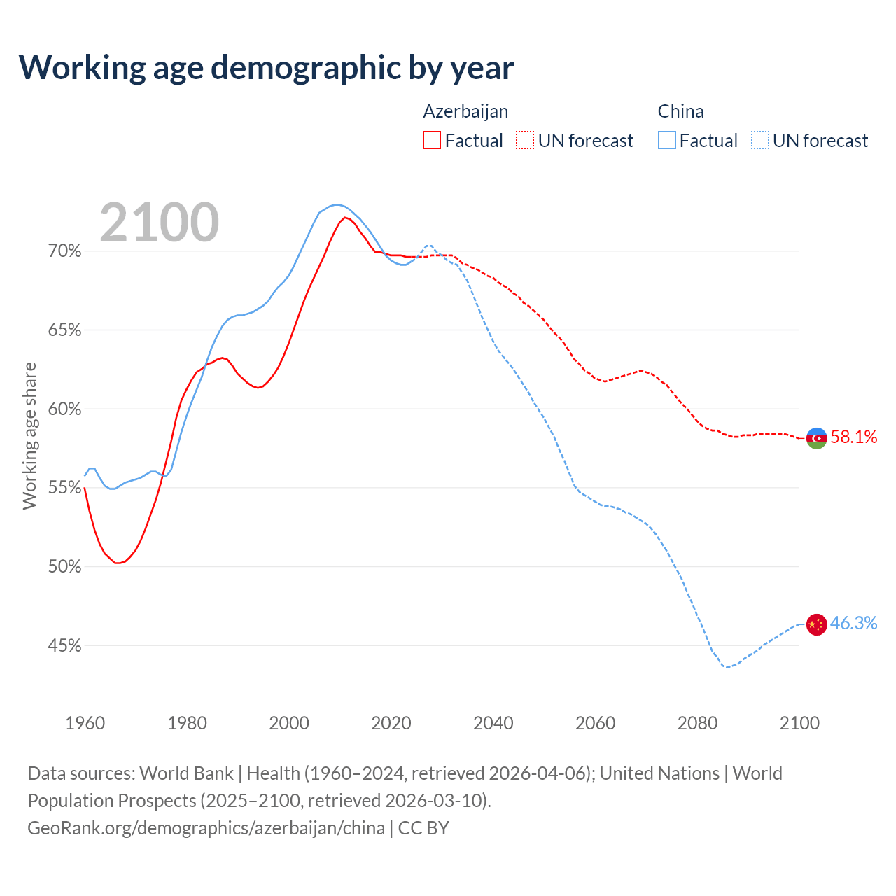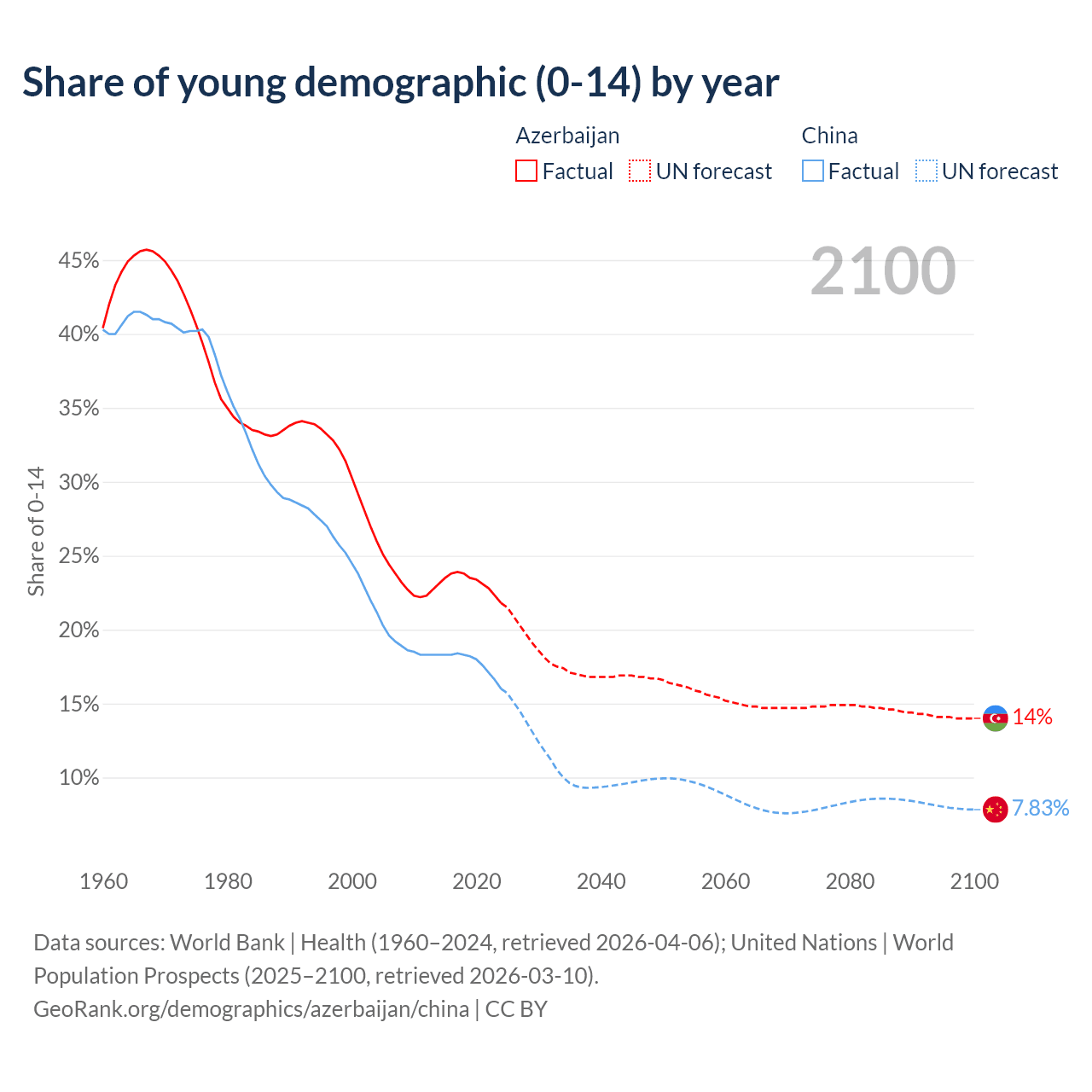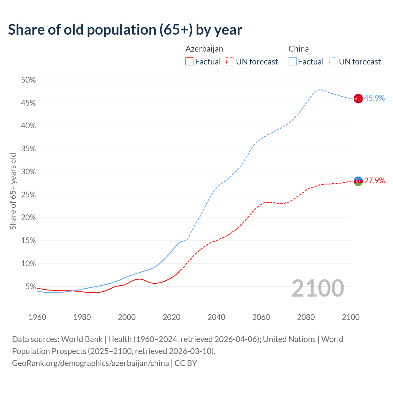 Median age Azerbaijan vs China, 1960-2100