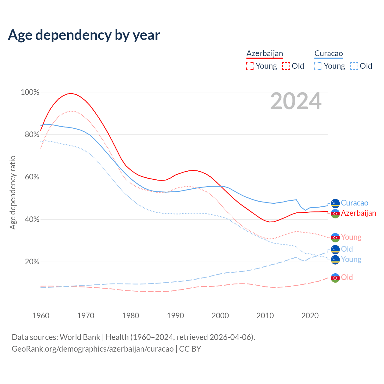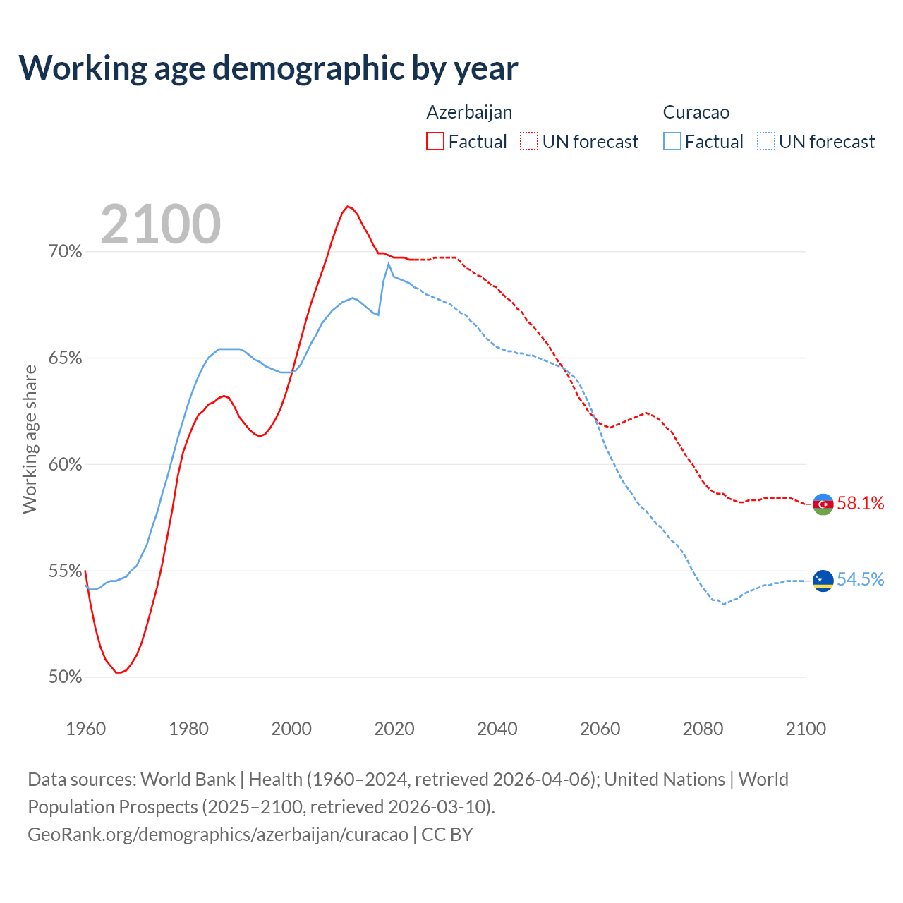 - The share of old-age demographic (65+) in Azerbaijan is 8.56% vs 16.8% in Curacao.