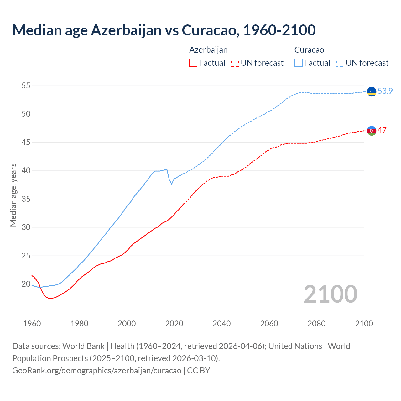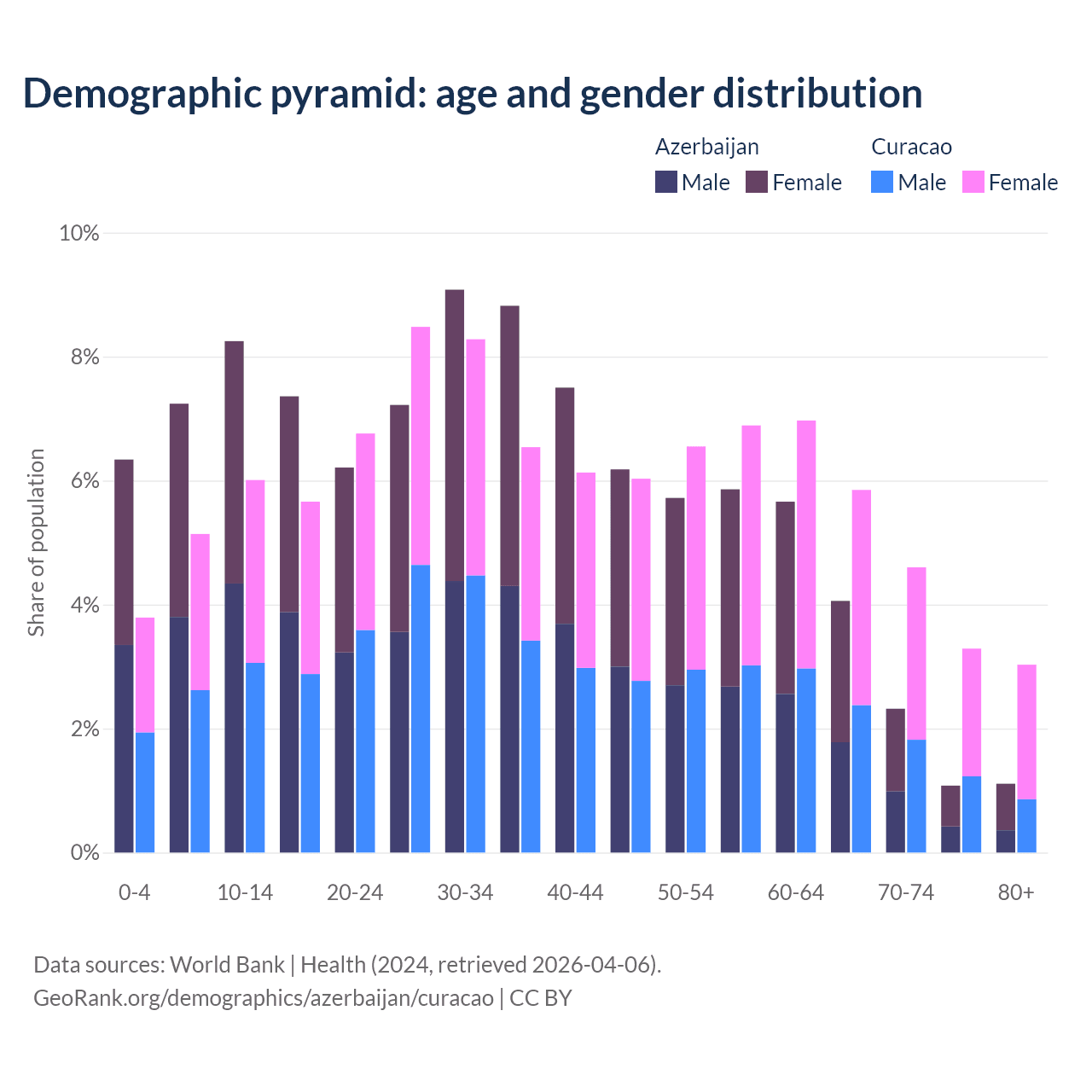 - Azerbaijan is ranked 82/196 by median age (oldest to youngest) vs 49/196 for Curacao.