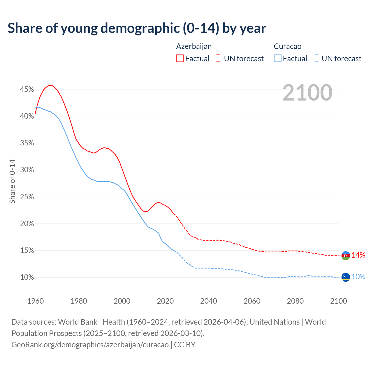 - The share of young demographic (0-15 years old) in Azerbaijan is 21.8% vs 14.9% in Curacao.
