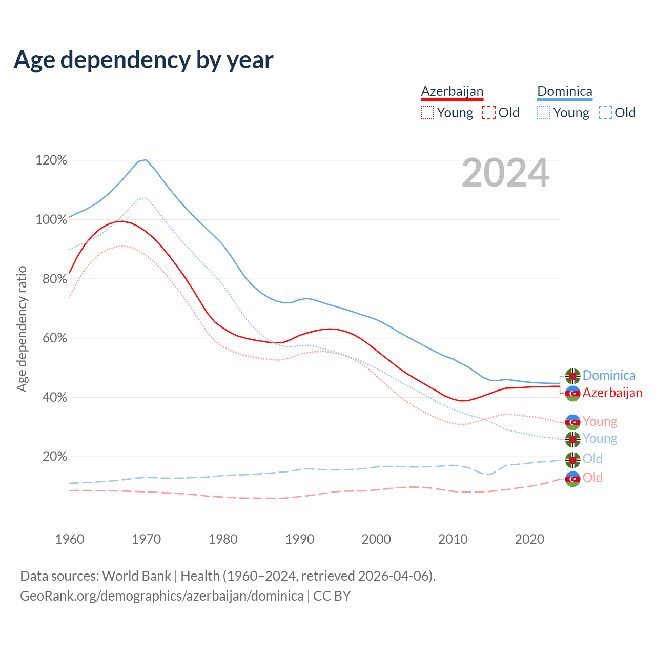 - Azerbaijan is ranked 82/196 by median age (oldest to youngest) vs 66/196 for Dominica.