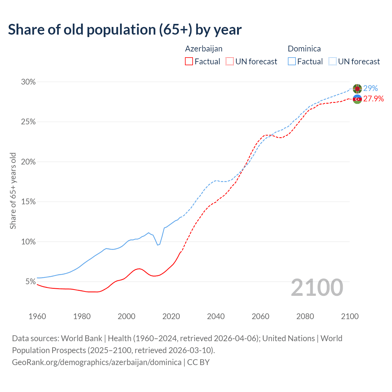 The share of older people aged 65 and over is 8.56% in Azerbaijan and 13% in Dominica. Life expectancy in Azerbaijan compared to Dominica .
