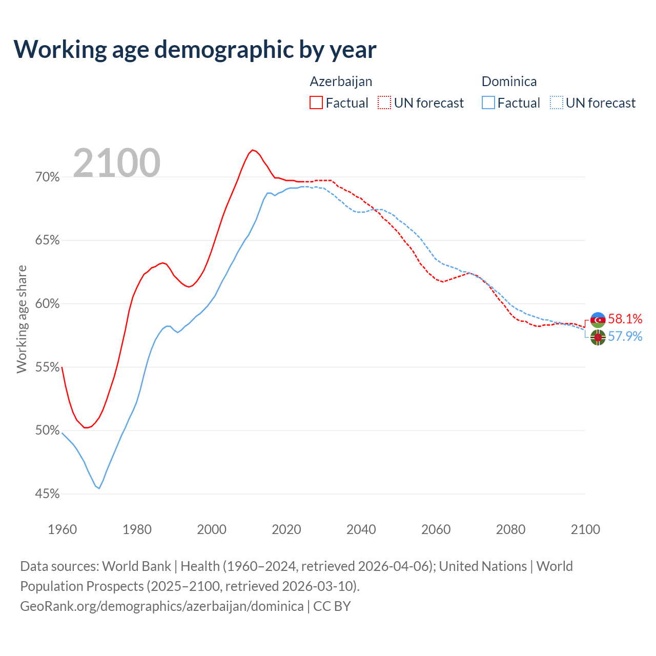- Azerbaijan has 7.2M working age adults (aged 15-64) vs 45.3K in Dominica.