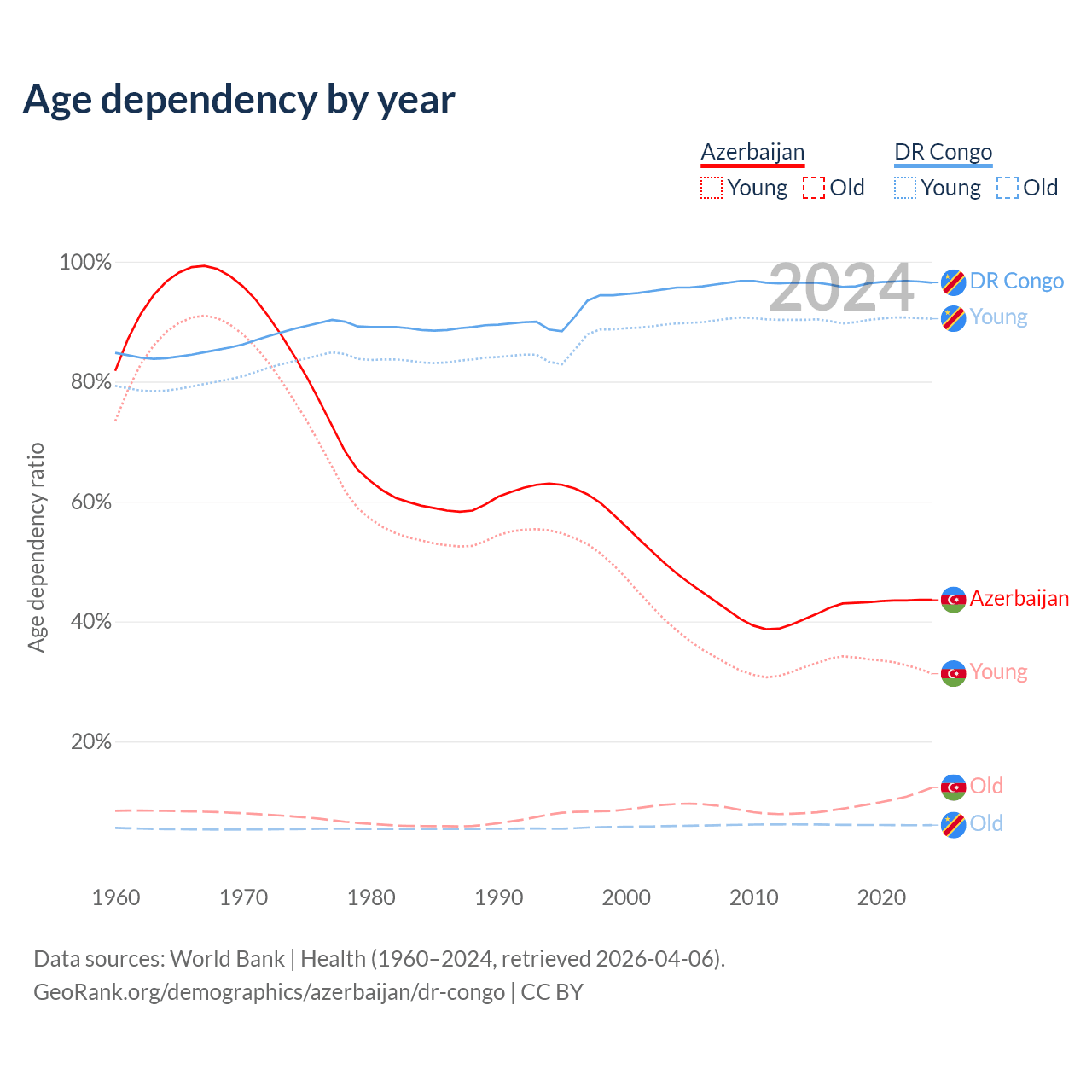 - Azerbaijan is ranked 82/196 by median age (oldest to youngest) vs 191/196 for the DR Congo.