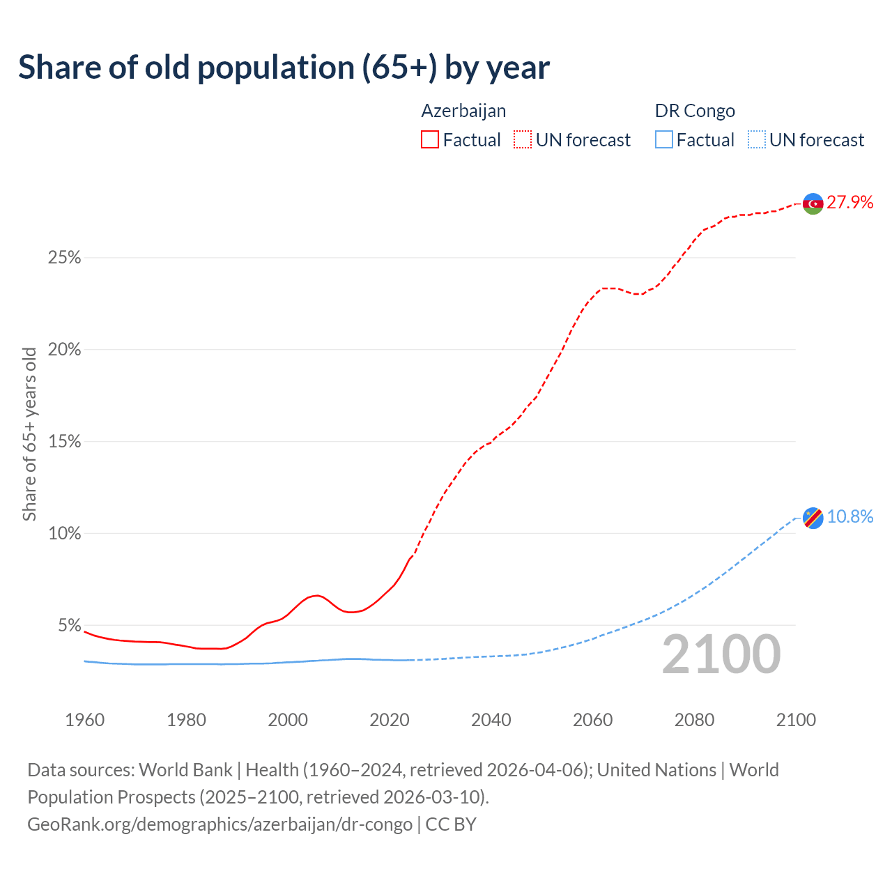 The share of older people aged 65 and over is 8.56% in Azerbaijan and 3.08% in the DR Congo. Life expectancy in Azerbaijan compared to the DR Congo .