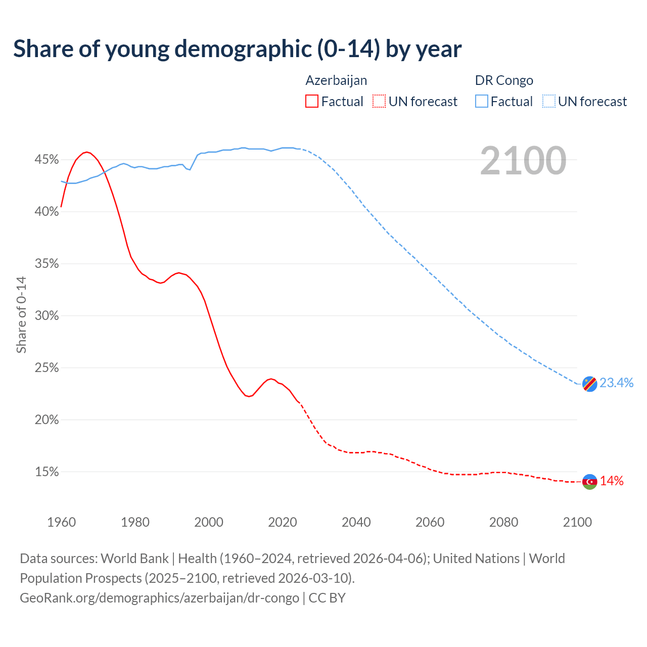 - The share of young demographic (0-15 years old) in Azerbaijan is 21.8% vs 46% in the DR Congo.