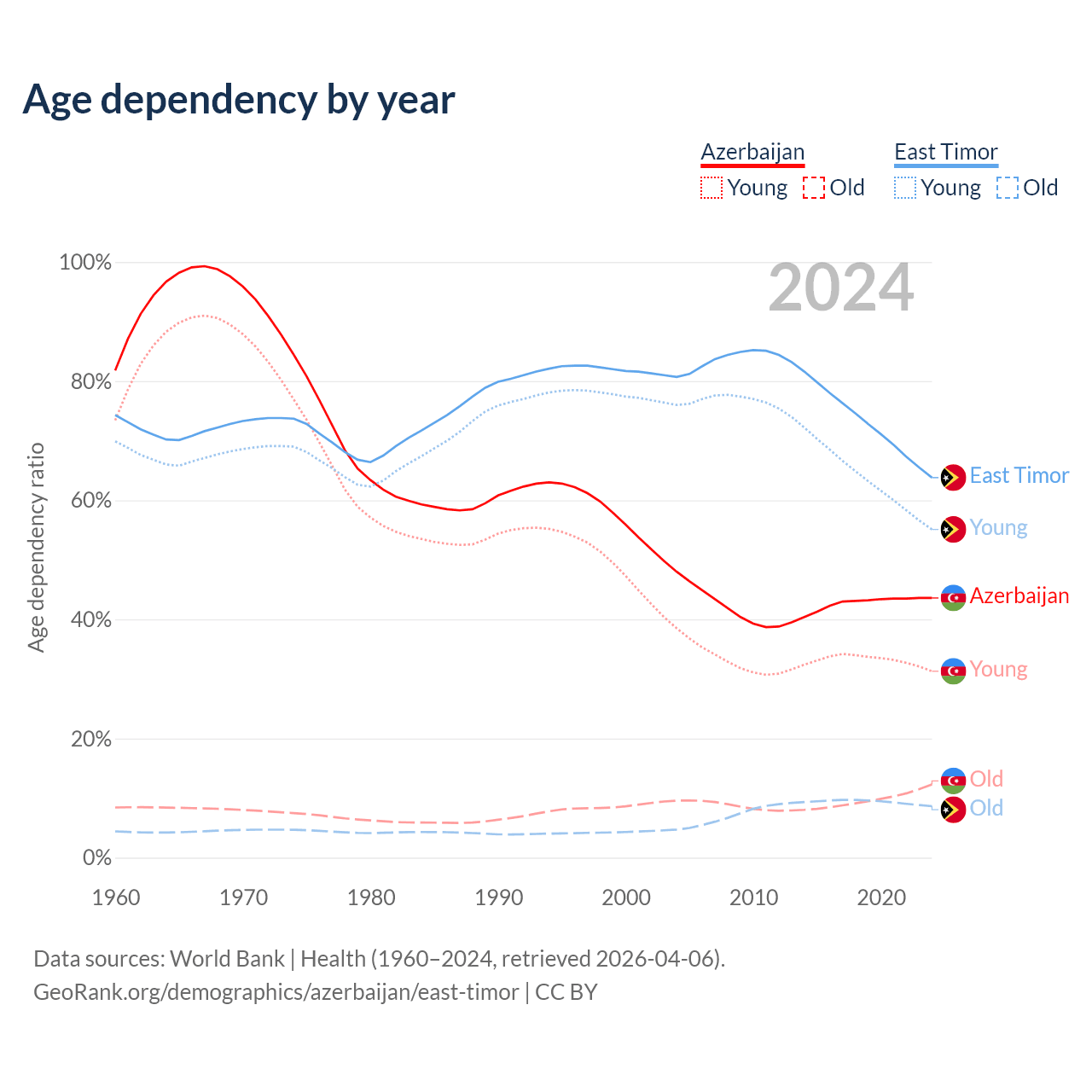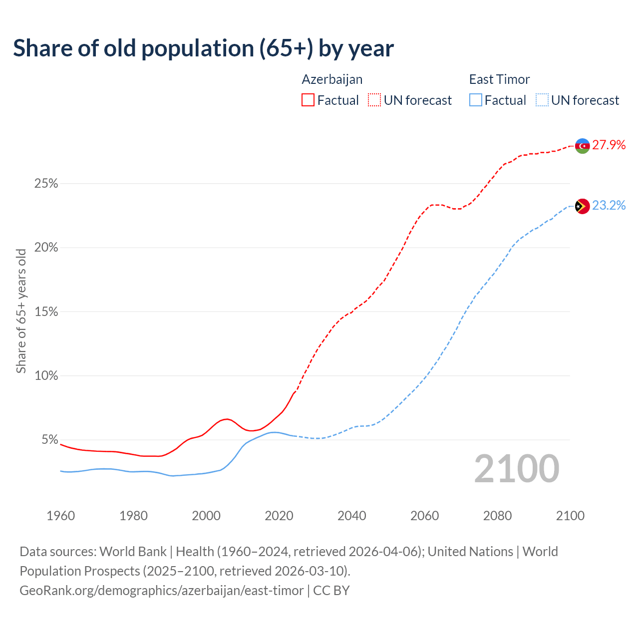- The share of old-age demographic (65+) in Azerbaijan is 8.56% vs 5.28% in East Timor.