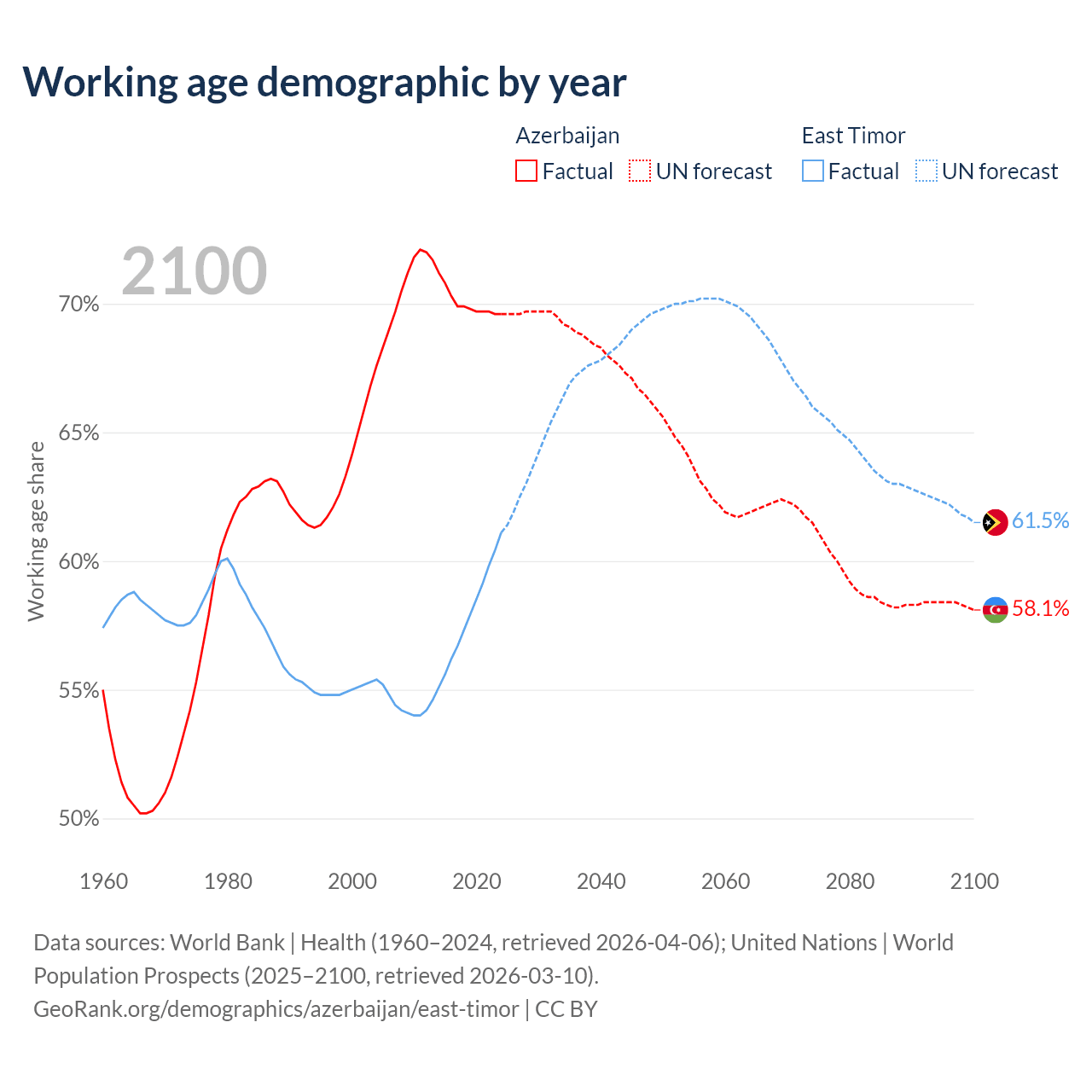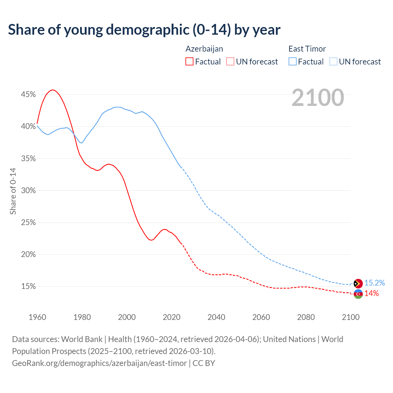 Median age Azerbaijan vs East Timor, 1960-2100