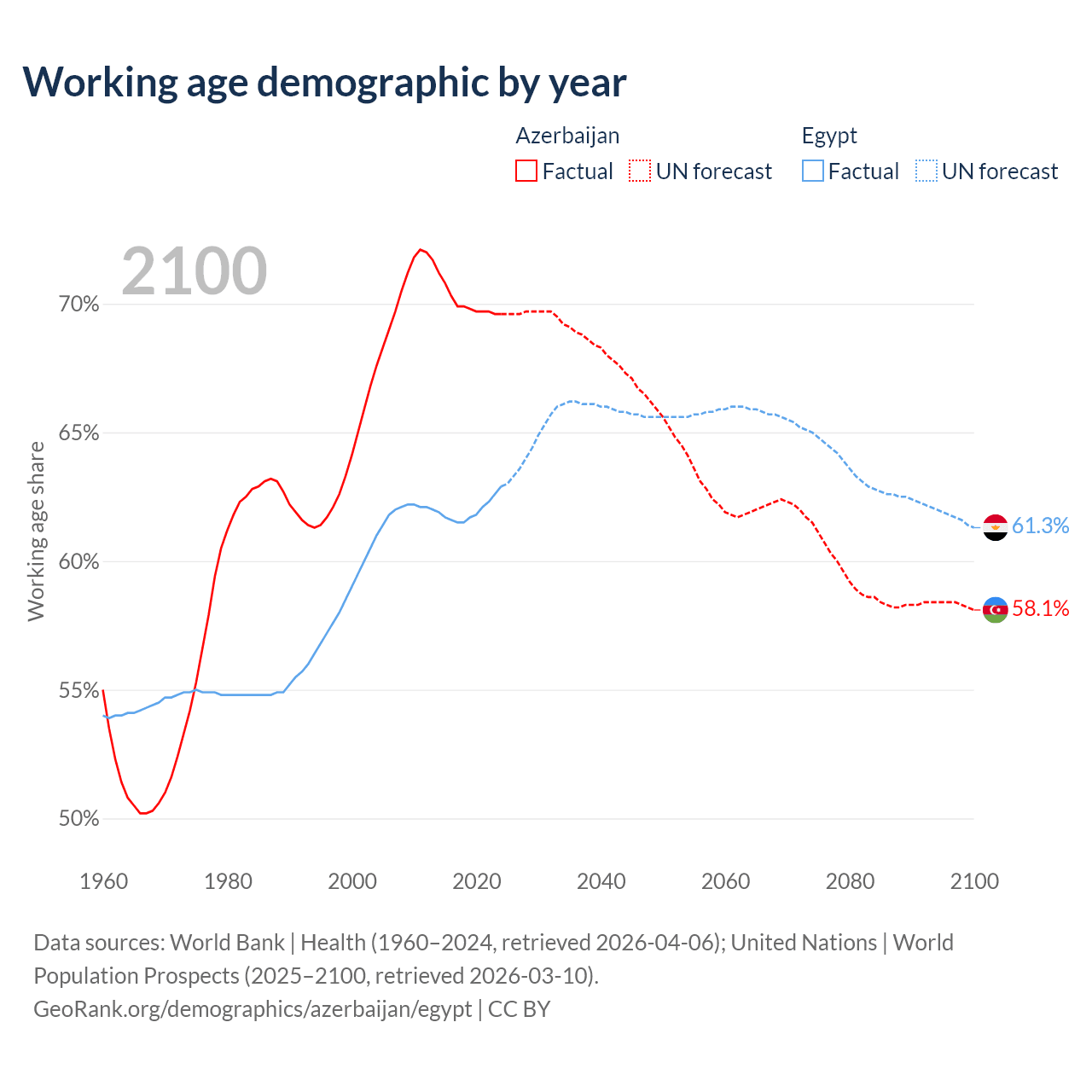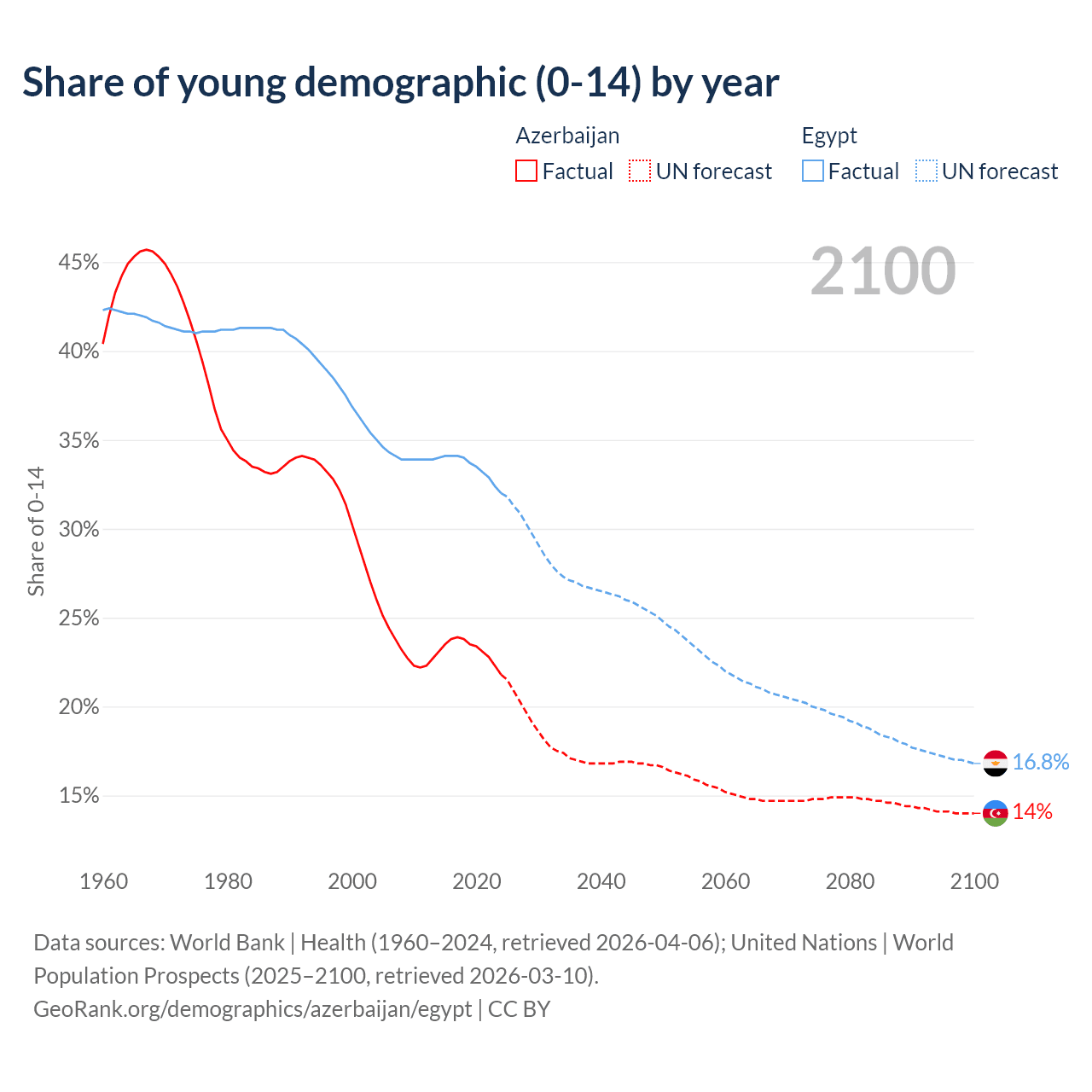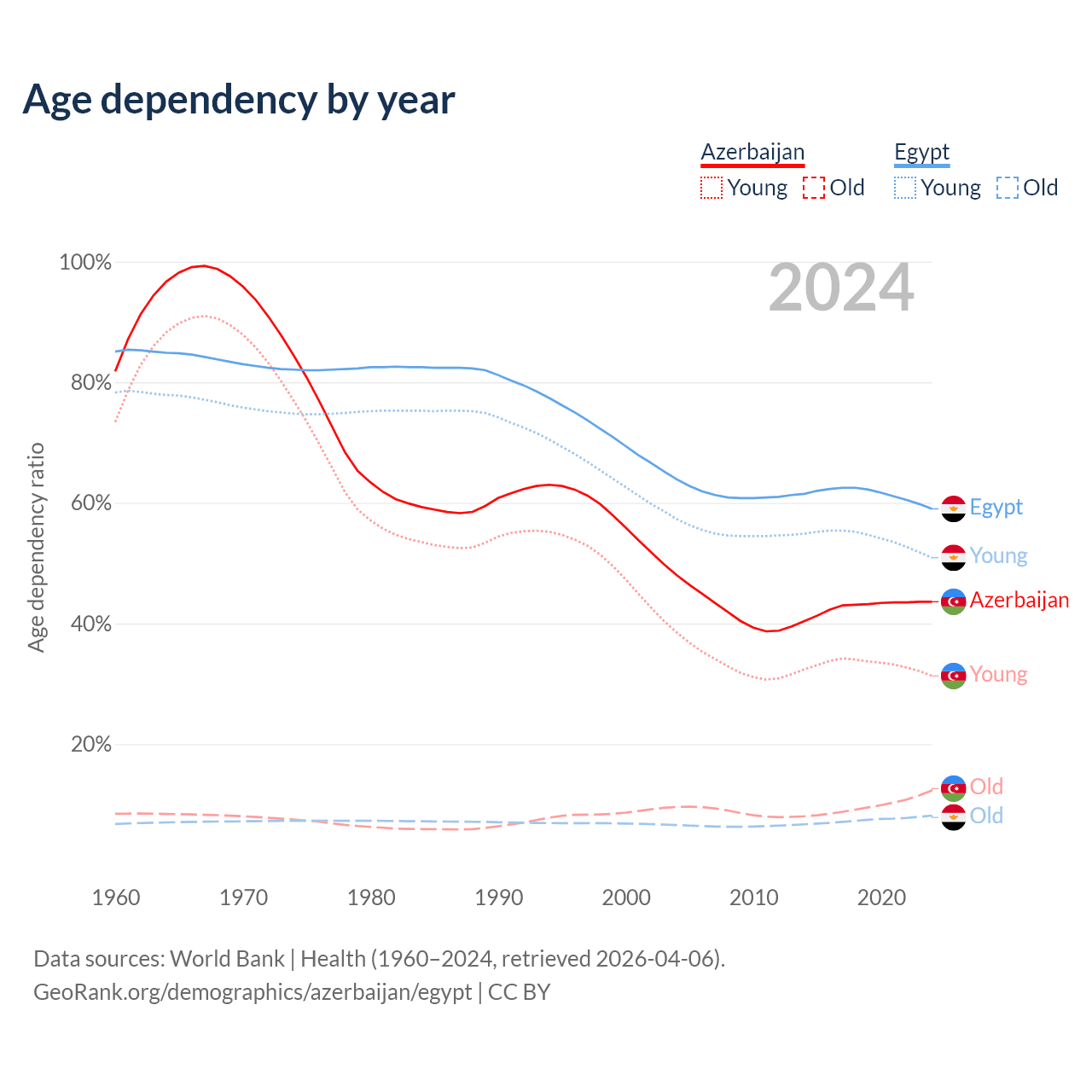 - Azerbaijan is ranked 82/196 by median age (oldest to youngest) vs 133/196 for Egypt.