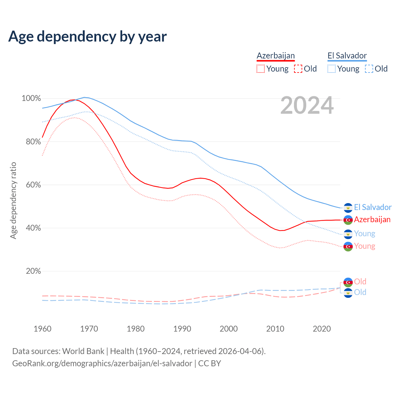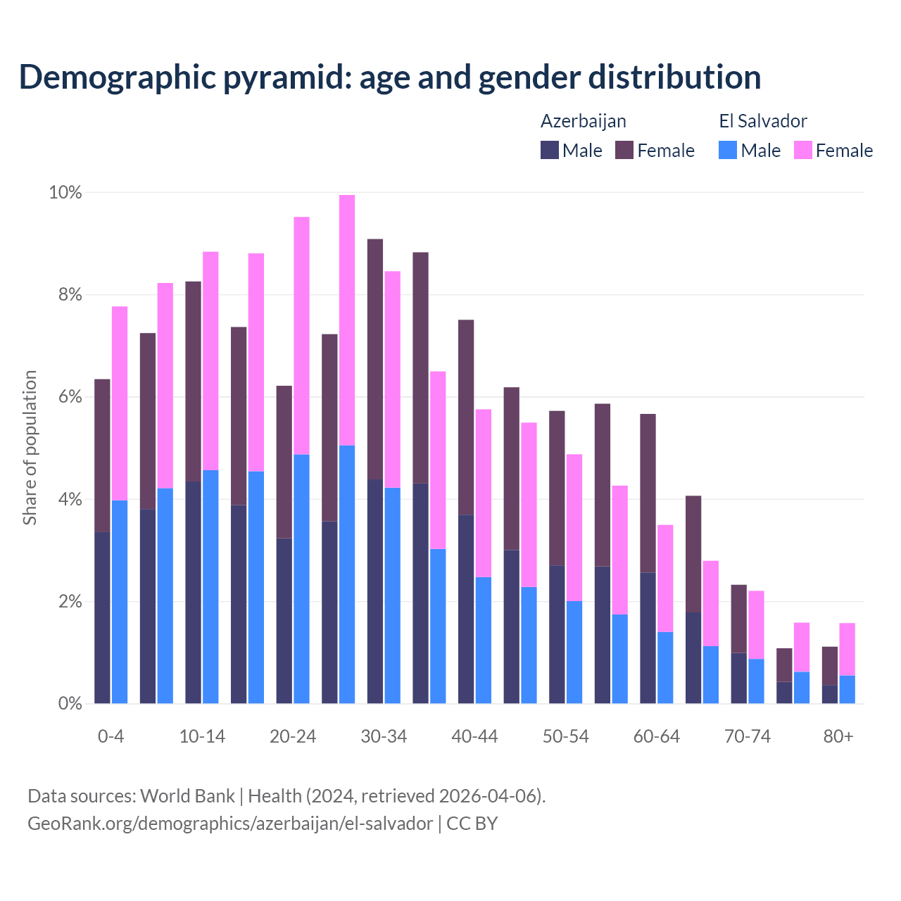- Azerbaijan is ranked 82/196 by median age (oldest to youngest) vs 115/196 for El Salvador.