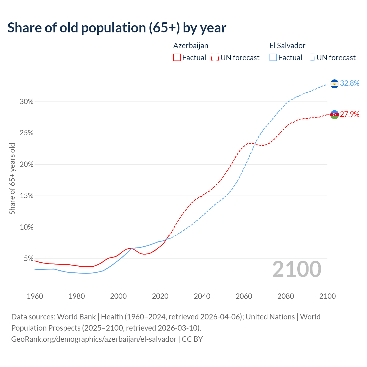 The share of older people aged 65 and over is 8.56% in Azerbaijan and 8.15% in El Salvador. Life expectancy in Azerbaijan compared to El Salvador .