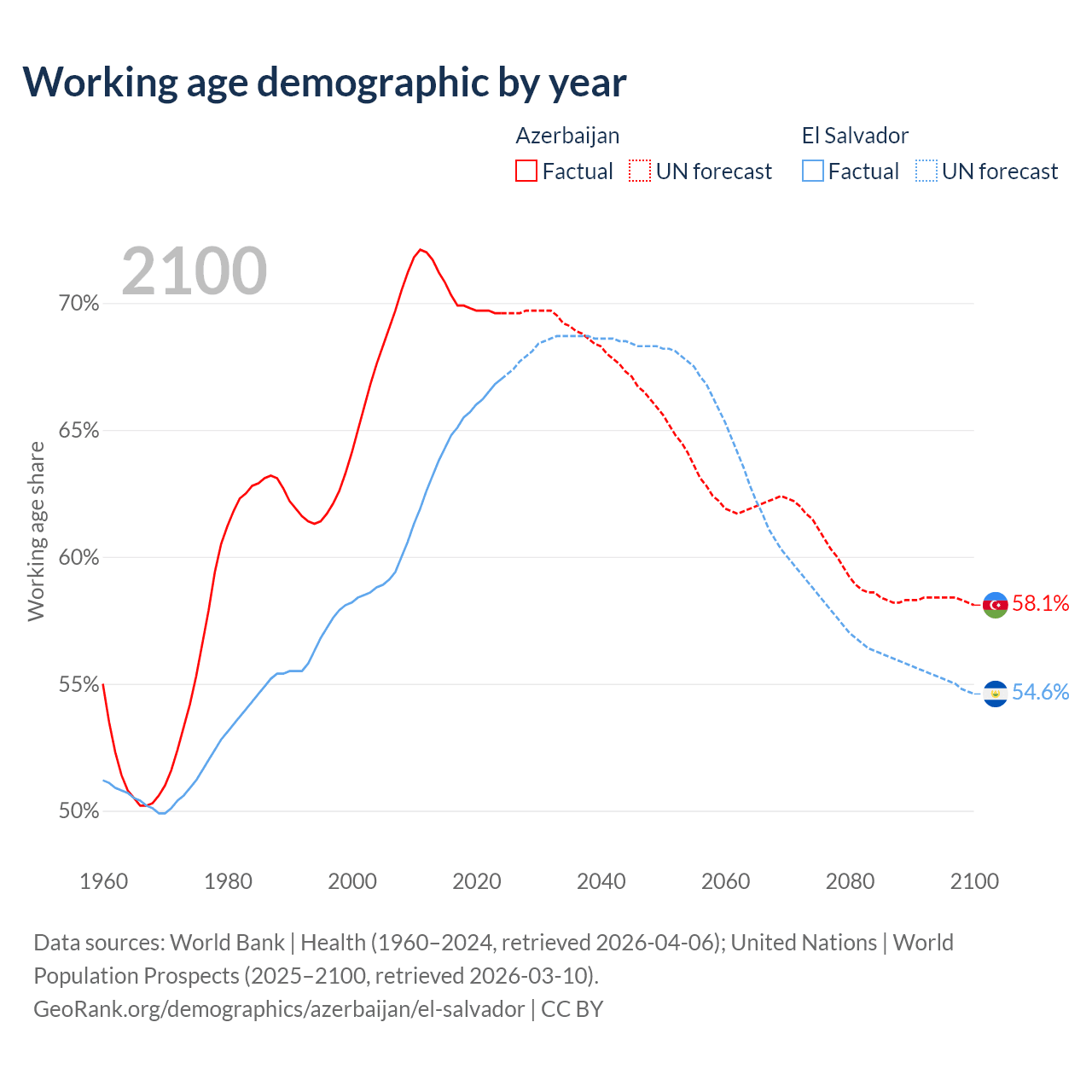 Median age Azerbaijan vs El Salvador, 1960-2100