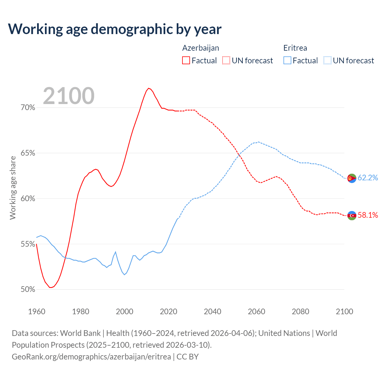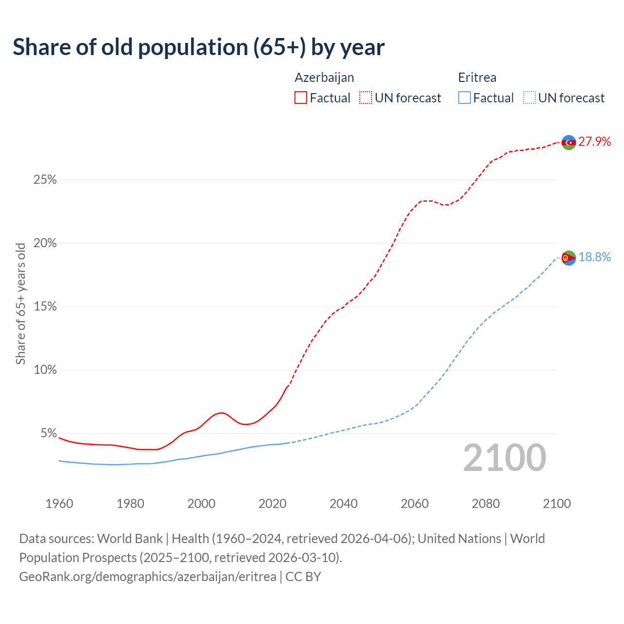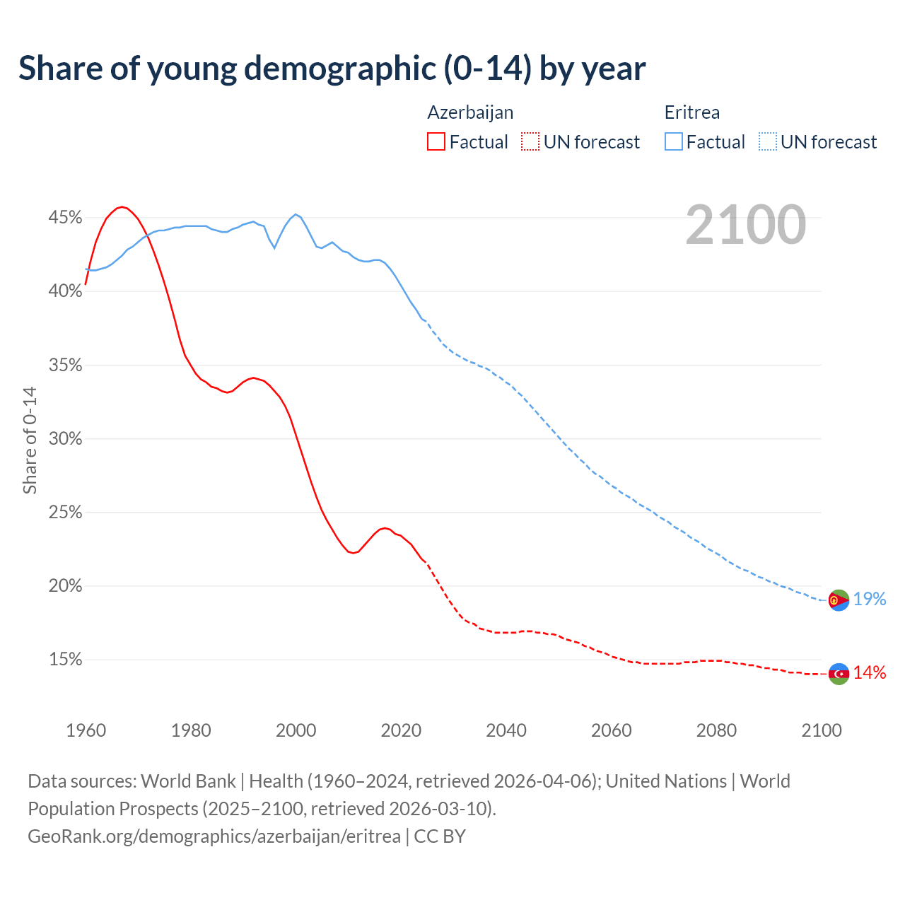 Median age Azerbaijan vs Eritrea, 1960-2100