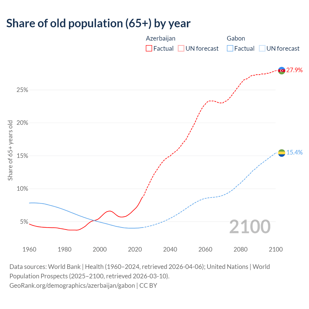 The share of older people aged 65 and over is 8.56% in Azerbaijan and 4.08% in Gabon. Life expectancy in Azerbaijan compared to Gabon .