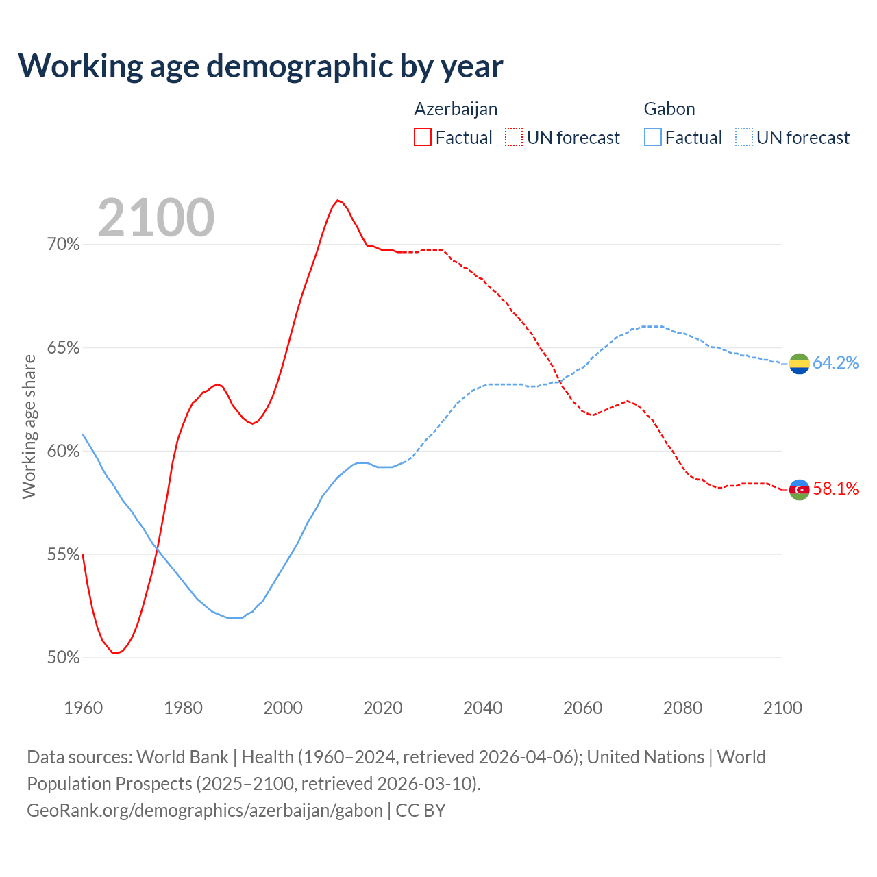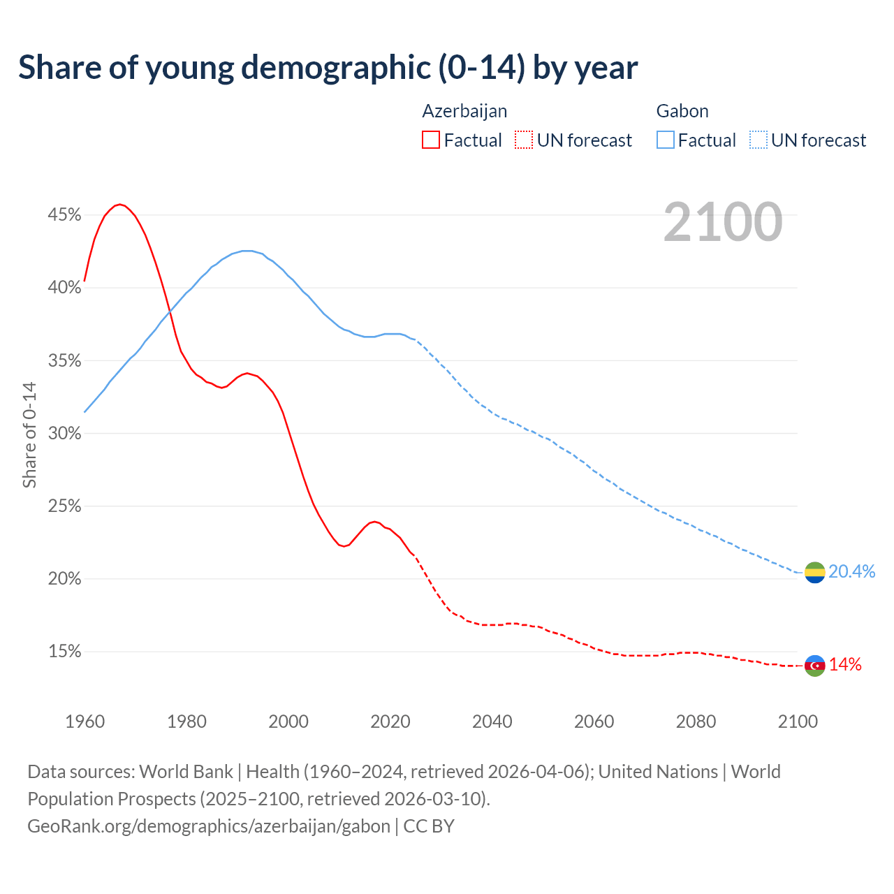 Median age Azerbaijan vs Gabon, 1960-2100