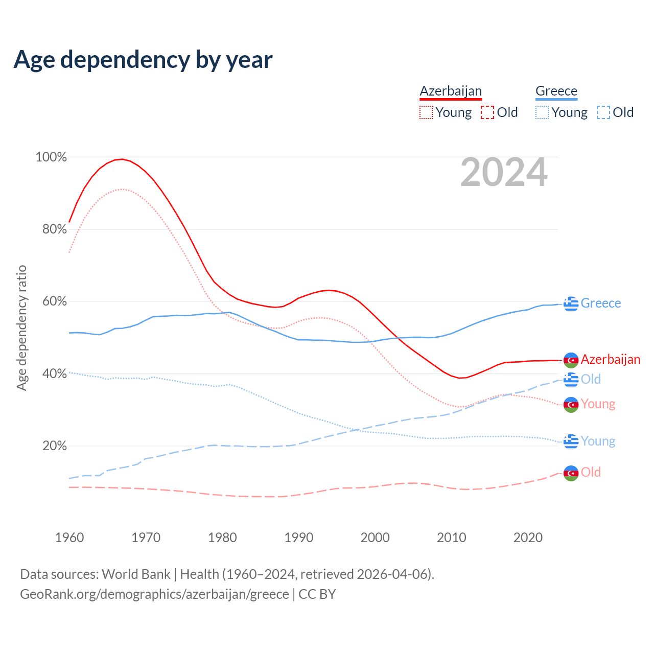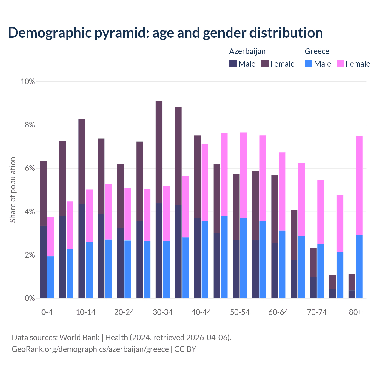 - Azerbaijan is ranked 82/196 by median age (oldest to youngest) vs 6/196 for Greece.