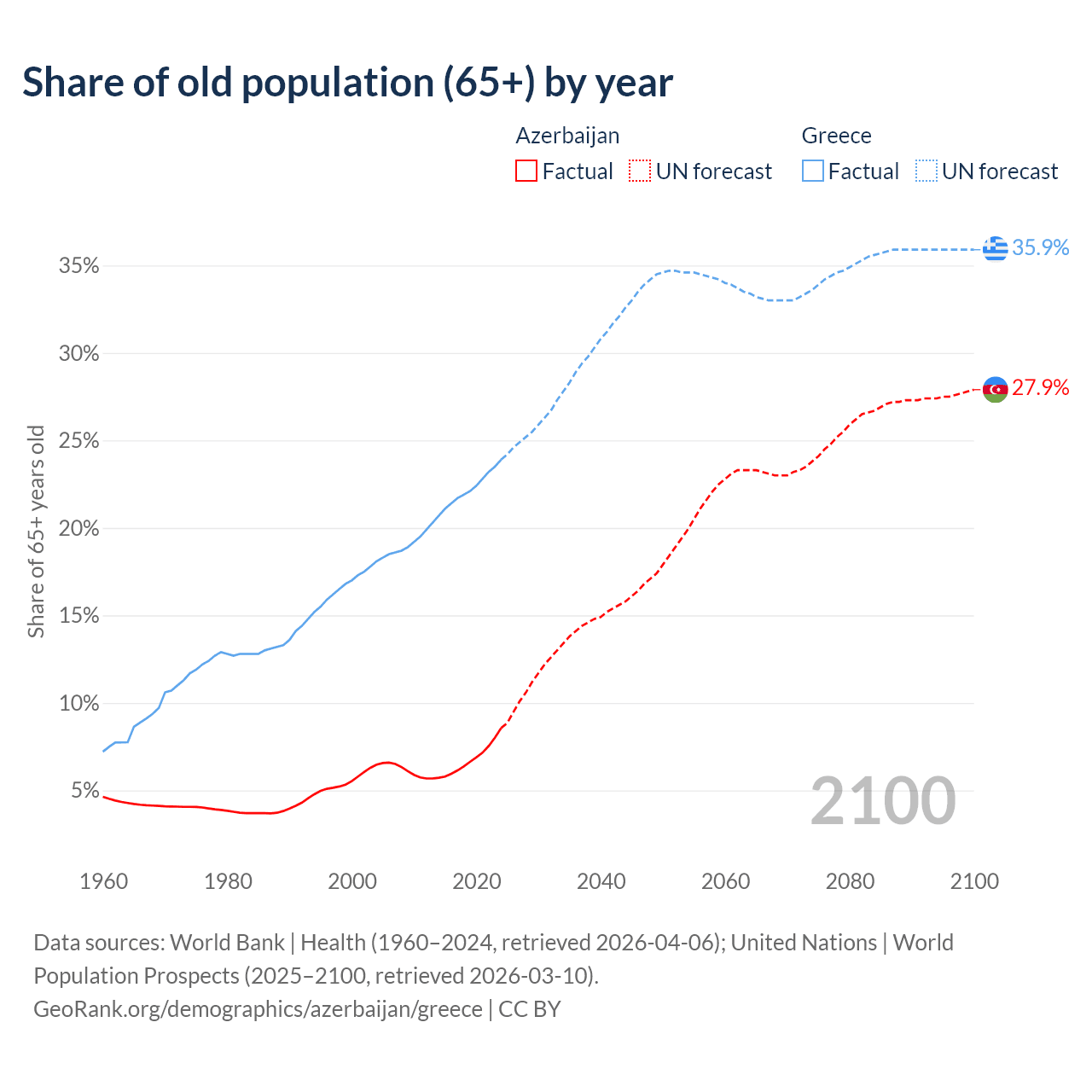 The share of older people aged 65 and over is 8.56% in Azerbaijan and 23.9% in Greece. Life expectancy in Azerbaijan compared to Greece .