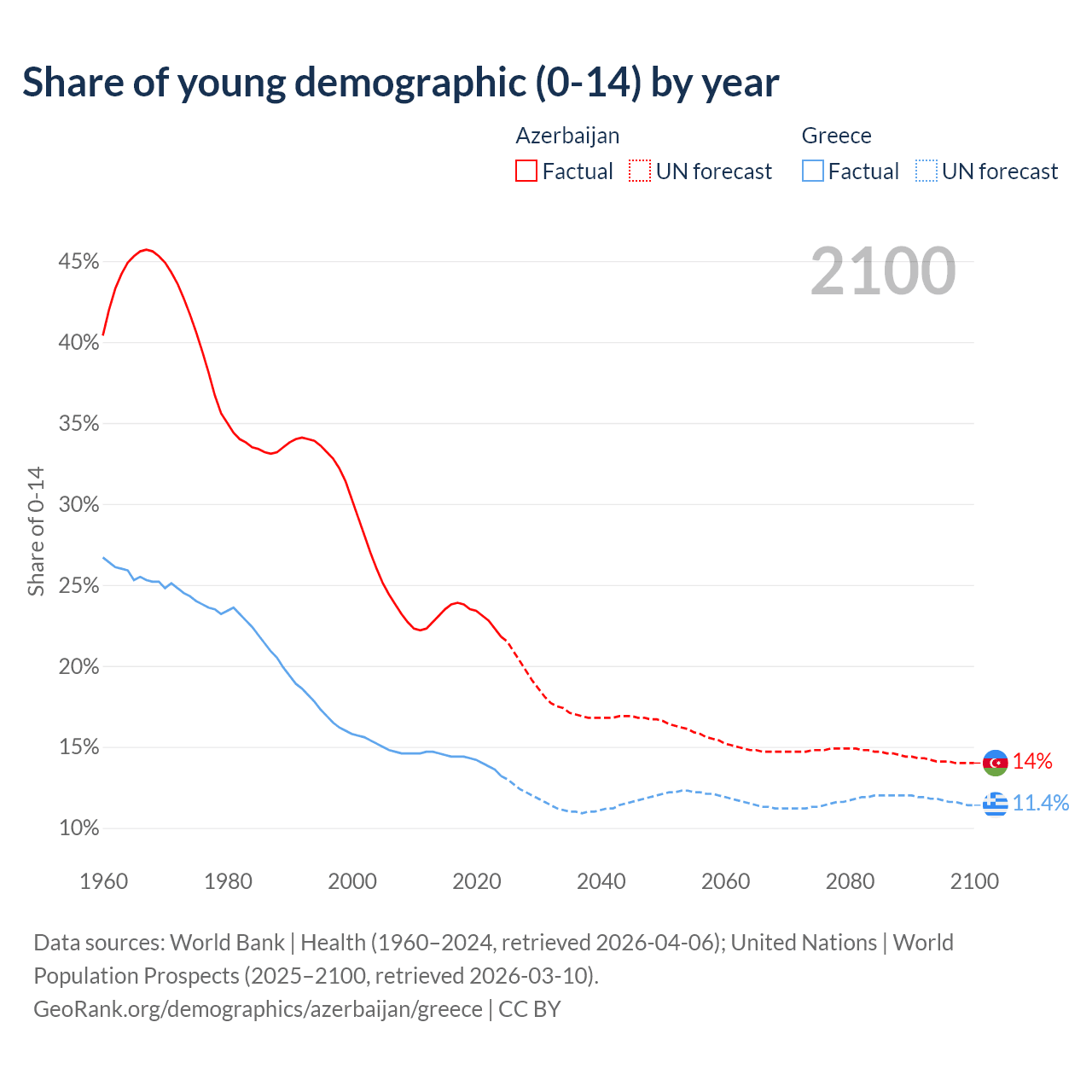 - The share of young demographic (0-15 years old) in Azerbaijan is 21.8% vs 13.2% in Greece.